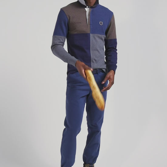Découvrez notre maillot colorblock dit maillot coupé-cousu, une pièce audacieuse où quatre coloris se rencontrent assemblés en piqué cousu en cadrans harmonieux. Disponible en deux nuances, bleu clair et bleu foncé chiné, ce maillot manches longues à la coupe droite offre un design dynamique et moderne, idéal pour un look original et contemporain.