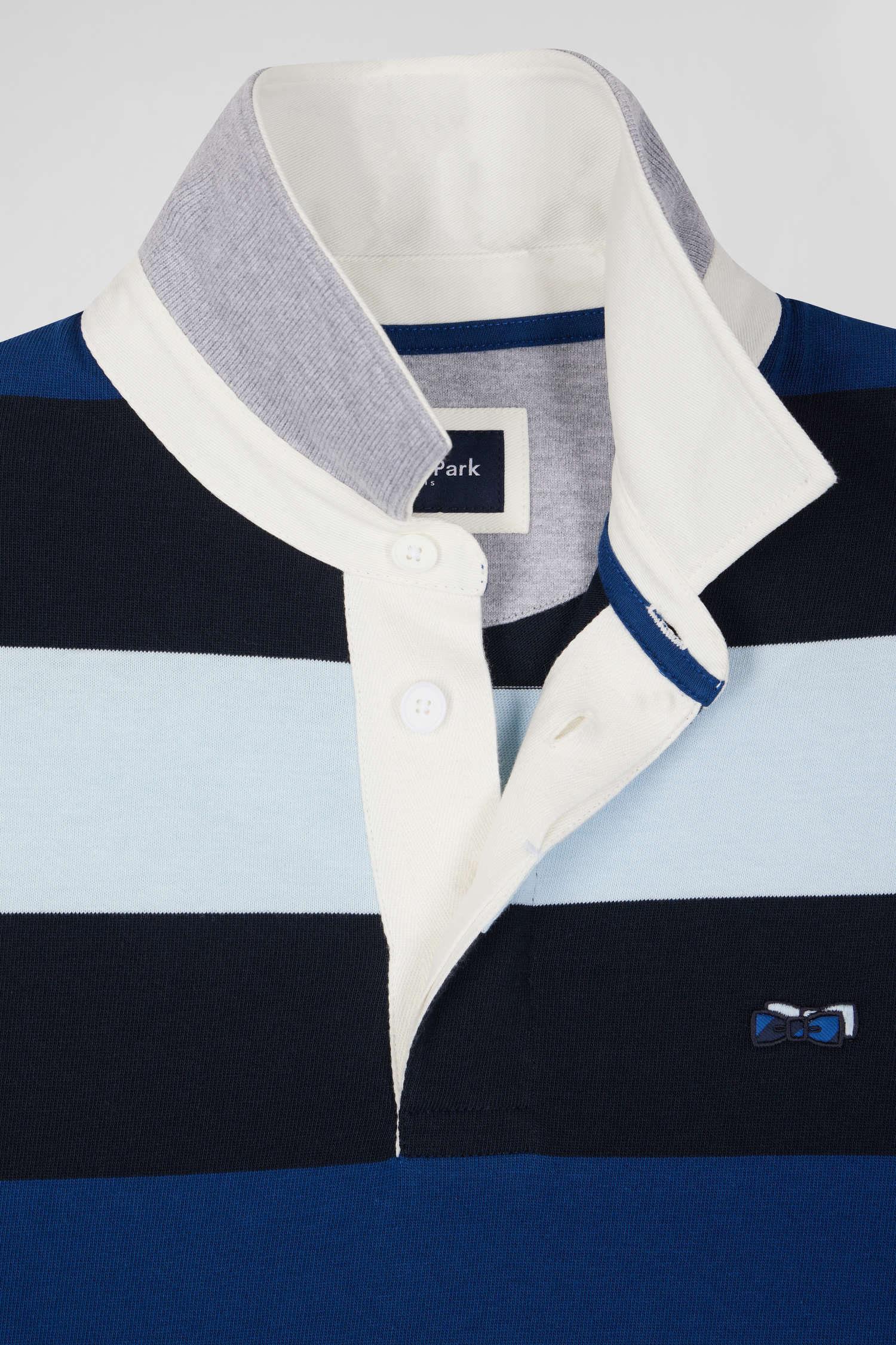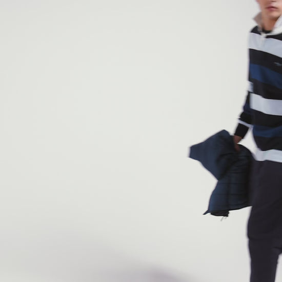 Notre iconique maillot cerclé en jersey de coton s'inspire du rugby, offrant un style unique avec ses rayures larges et ses boutons ovales siglés. Parfait pour ceux qui cherchent à allier passion pour le rugby et sens de la mode, ce maillot cerclé en jersey apporte une élégance sportive à tous les vestiaires. Ce modèle se distingue aussi par sa broderie nœud papillon rehaussée de tissu cravate rayé.
