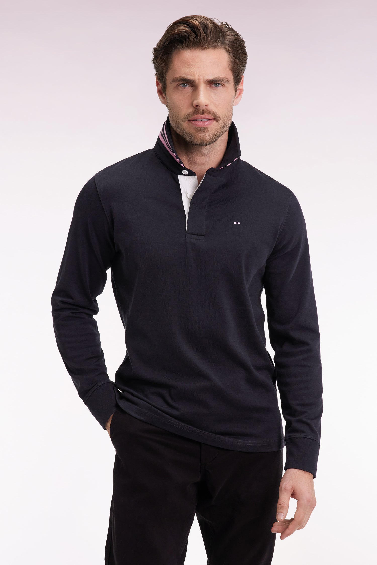 Jersey de coton Pima 4 fils et coupe droite parachevée de bords-côtes tricotés à plat assurent une tenue durable à ce maillot à manches longues. Sa patte de boutonnage doublé de blanc et son col maillot marine offrent un élégant contraste renforcé par un dessous de col à fines rayures. Un modèle sport-chic confortable et intemporel pensé pour l'homme moderne