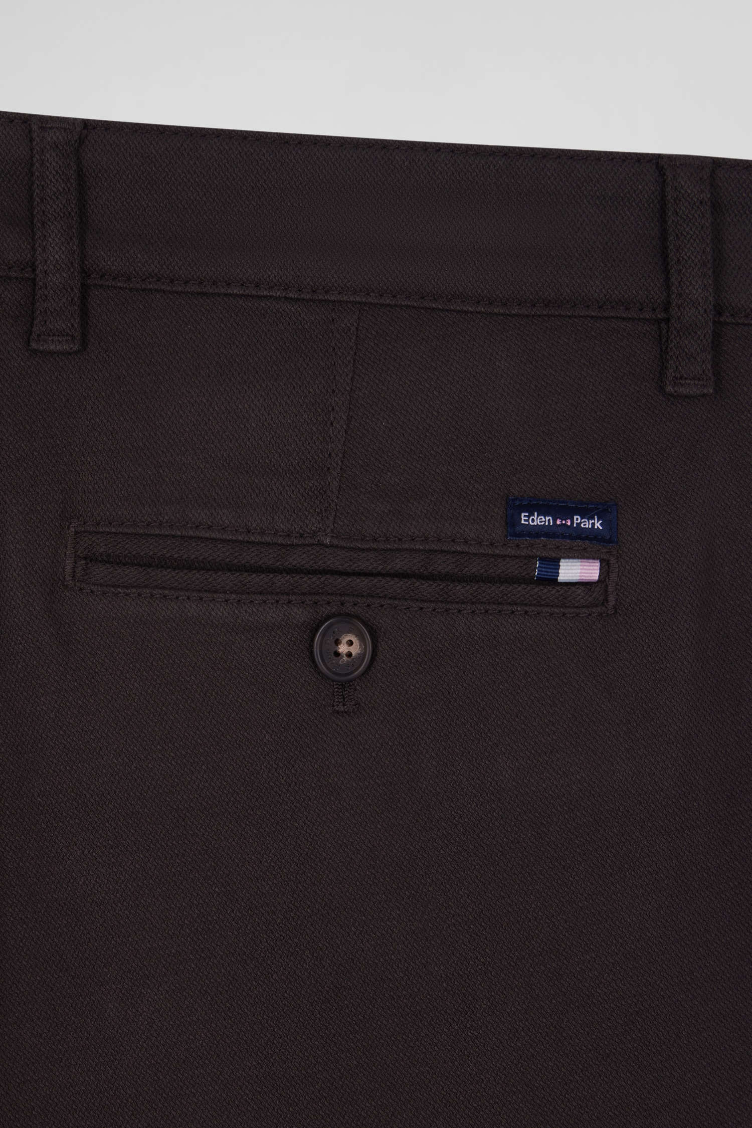 - Tissu cousu Eden Park au-dessus de la poche arrière avec ruban tricolore