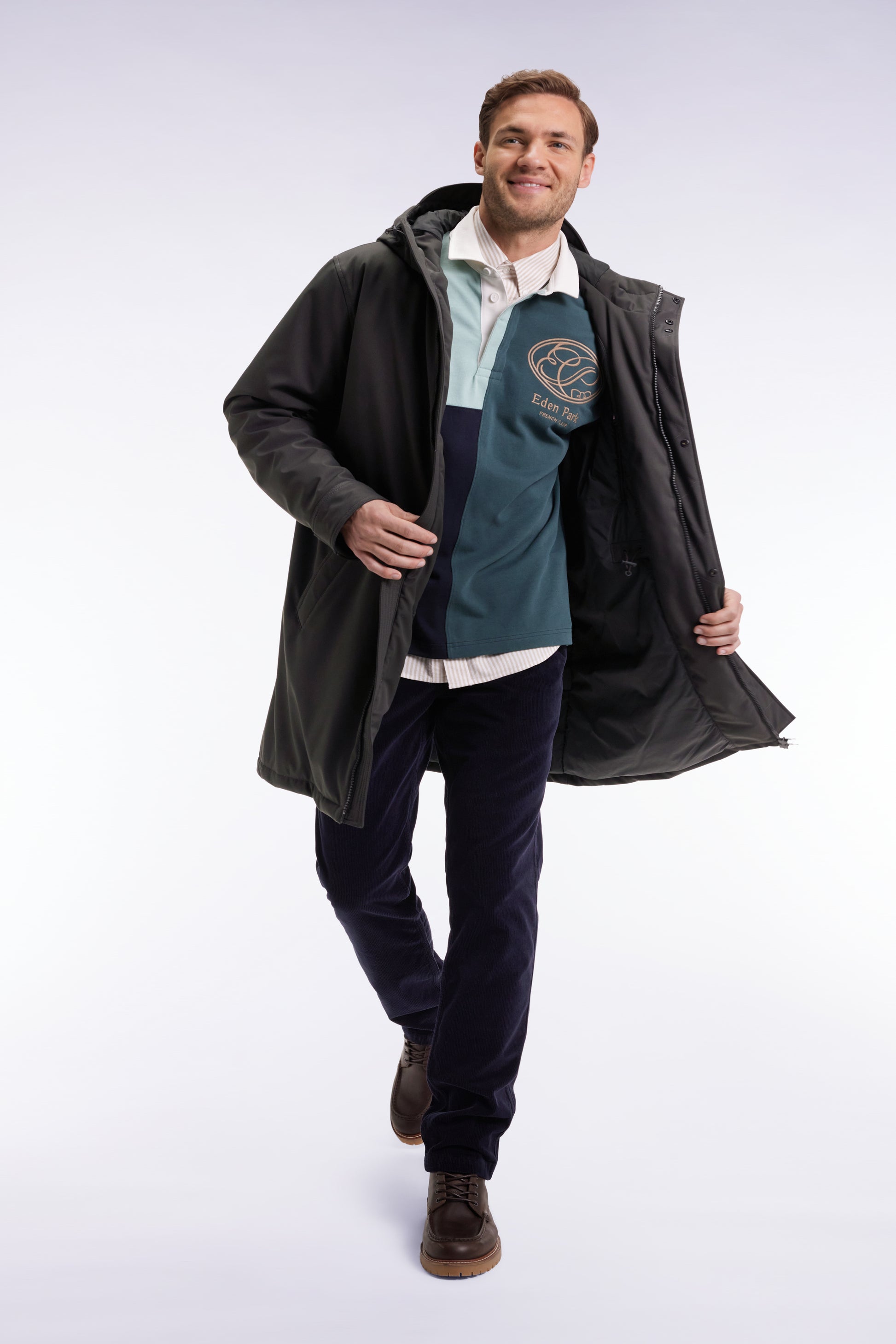 Déclinée en marine, kaki ou noir, cette parka longue en nylon mat incarne l’équilibre parfait entre sobriété urbaine et protection contre les éléments. Son matelassage intérieur offre un confort thermique idéal pour la mi-saison comme pour l’hiver. Sa silhouette s’ajuste grâce à un lien de serrage discret dans le dos et à la capuche. Le zip à double curseur dissimulé sous la patte de boutonnage, les poches pratiques et les finitions iconiques renforcent l’allure fonctionnelle et raffinée de cette parka masculine dotée de fournitures soft touch
