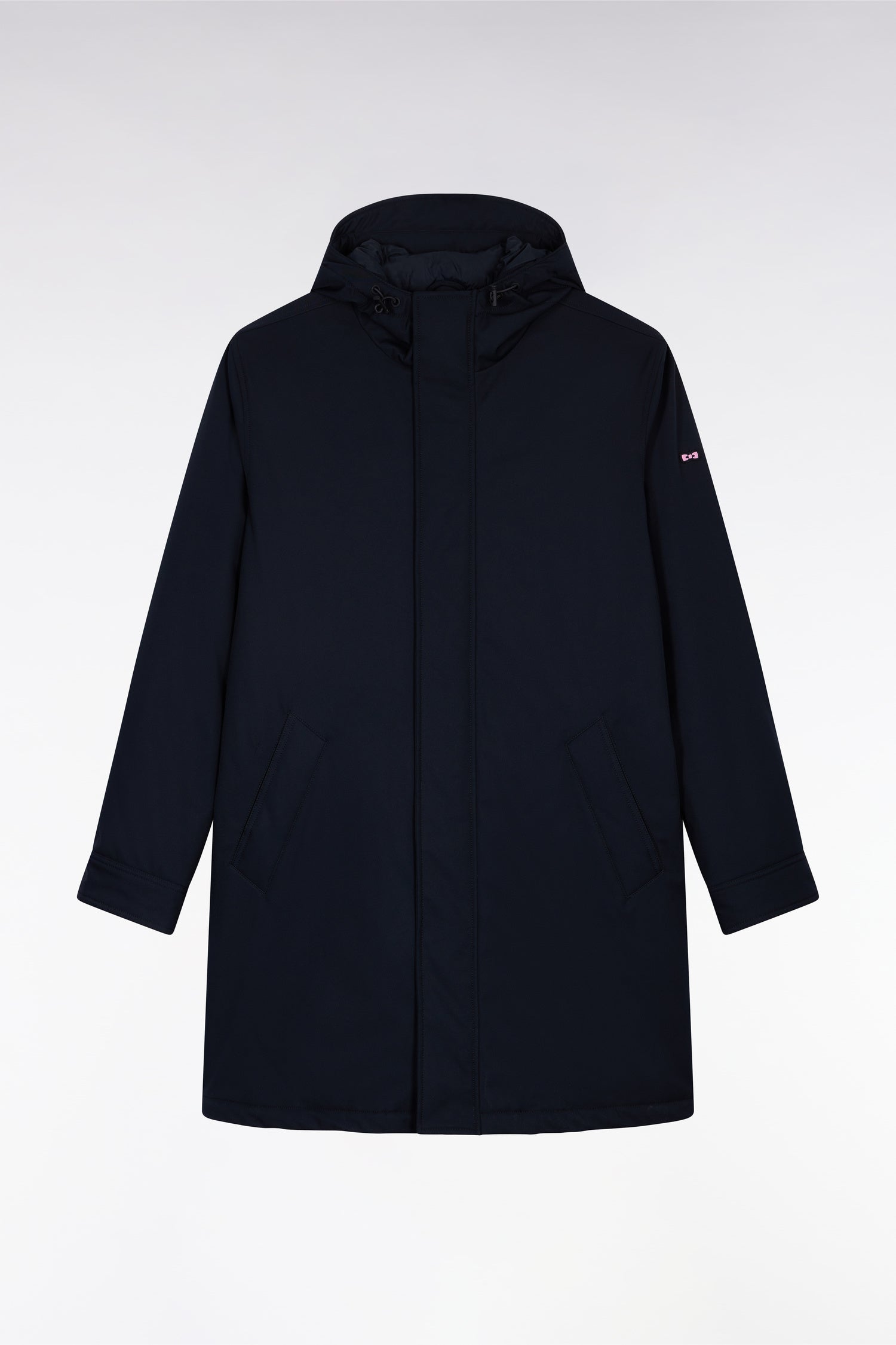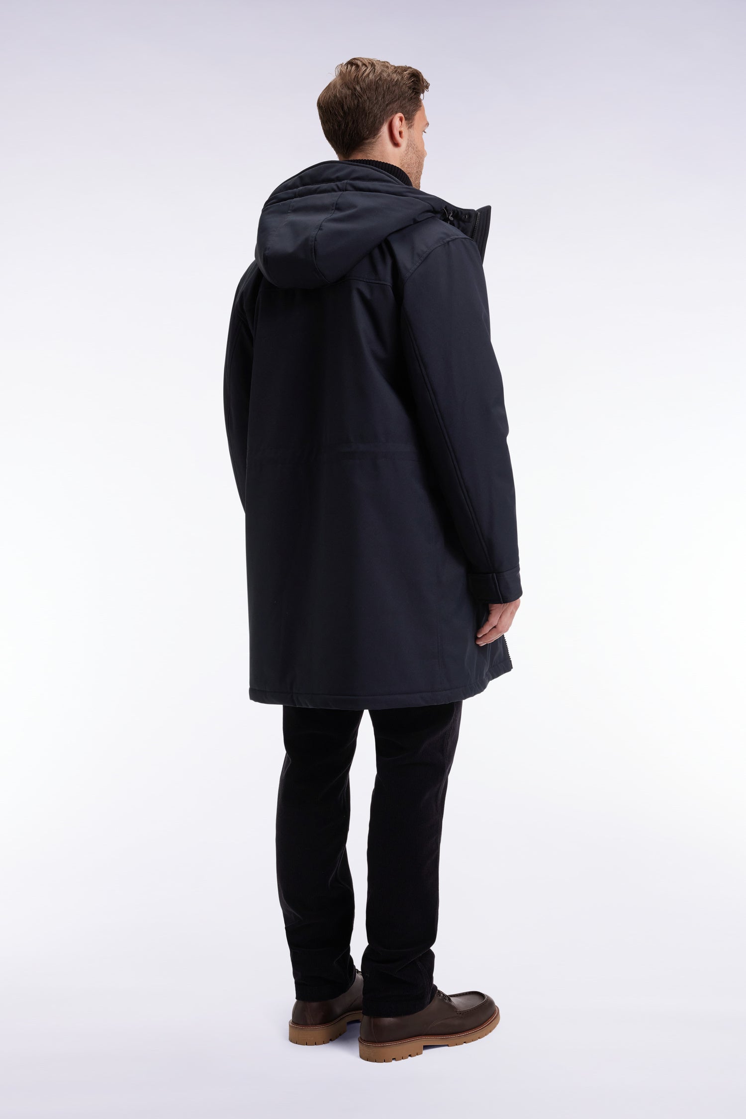 Déclinée en marine, kaki ou noir, cette parka longue en nylon mat incarne l’équilibre parfait entre sobriété urbaine et protection contre les éléments. Son matelassage intérieur offre un confort thermique idéal pour la mi-saison comme pour l’hiver. Sa silhouette s’ajuste grâce à un lien de serrage discret dans le dos et à la capuche. Le zip à double curseur dissimulé sous la patte de boutonnage, les poches pratiques et les finitions iconiques renforcent l’allure fonctionnelle et raffinée de cette parka masculine dotée de fournitures soft touch