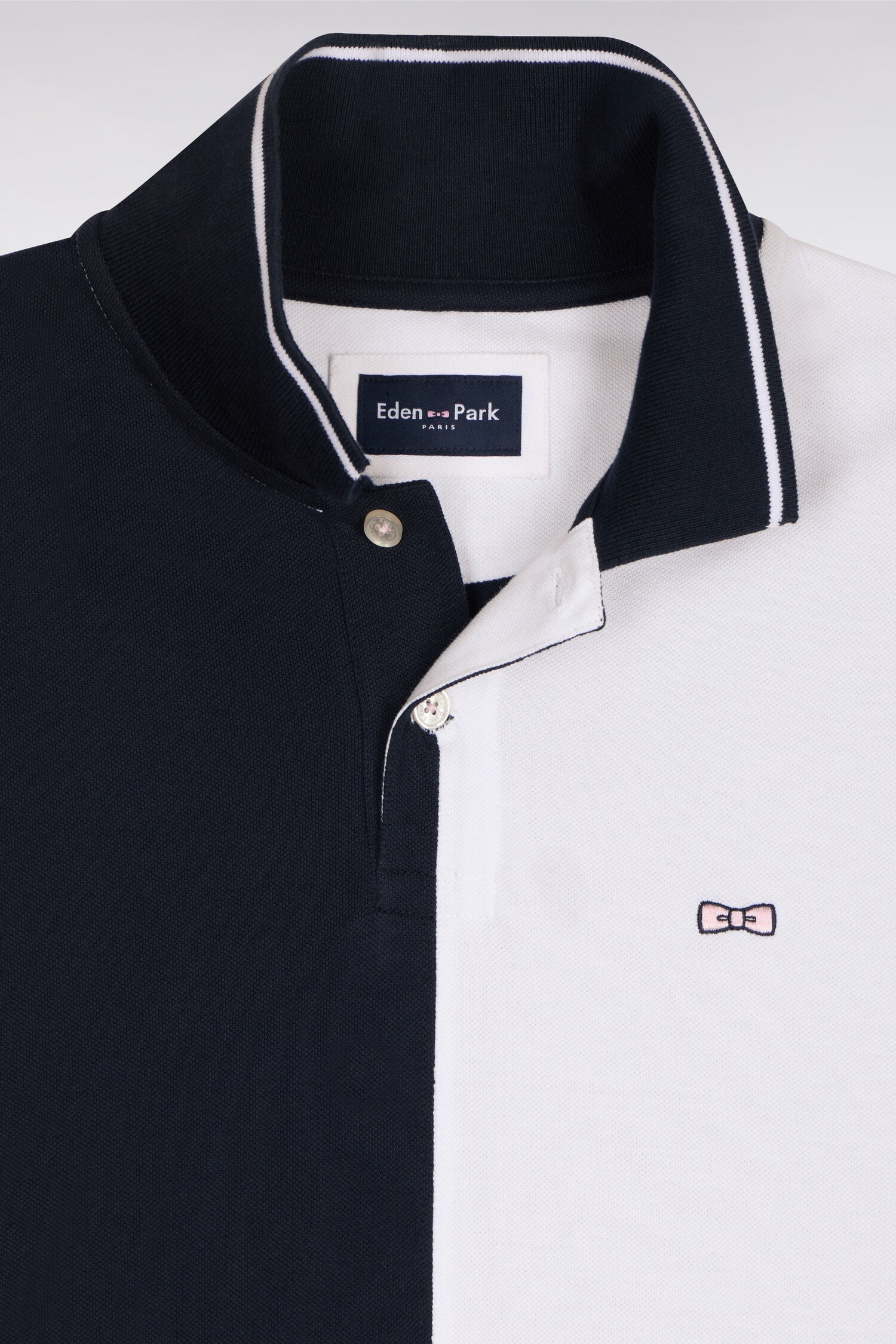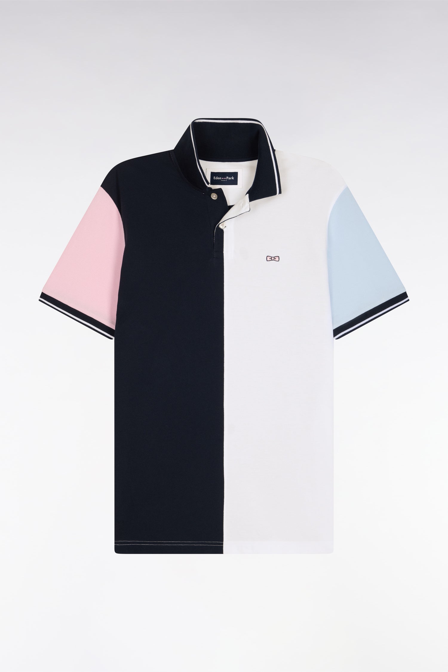 Ce polo en coton se distingue par ses manches contrastées et ses découpes verticales marine et blanc. Son col marine est souligné d'un liseré blanc, rappel de ses bordures de manches. La broderie nœud papillon rose Eden Park complète cette pièce sport-chic à la coupe droite classique, idéale pour la saison.