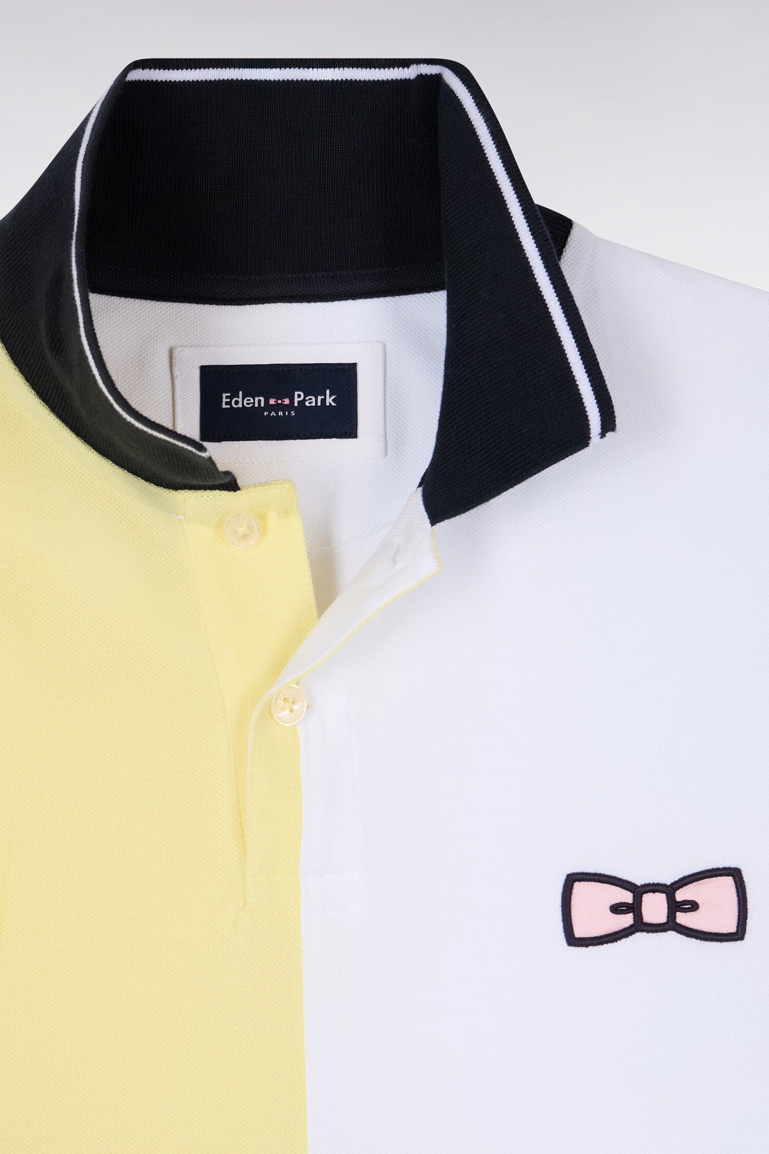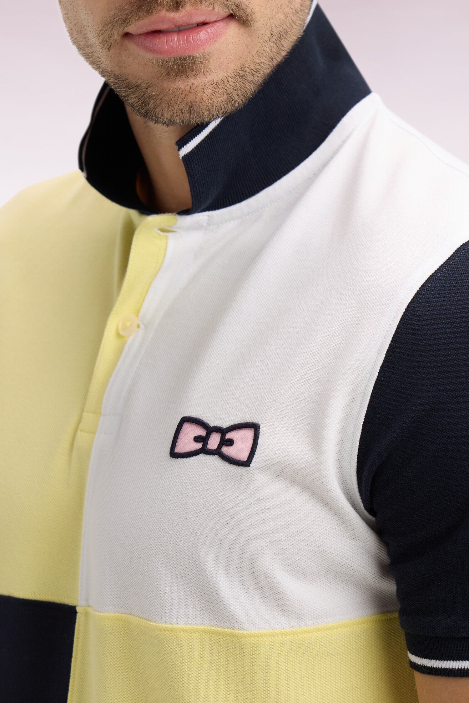 Ce polo en piqué de coton s’illustre par des contrastes soignés travaillés en cadrans et un liseré coordonné sur le col et les bas de manches, référence discrète aux codes du rugby et aux maillots les plus mythiques. Sa coupe nette et ses finitions soignées composent une silhouette moderne, facile à coordonner au quotidien. Ce polo à manches courtes est décliné en 4 coloris pastel : ciel, rose, jaune ou vert d'eau, toujours associés à notre marine signature.