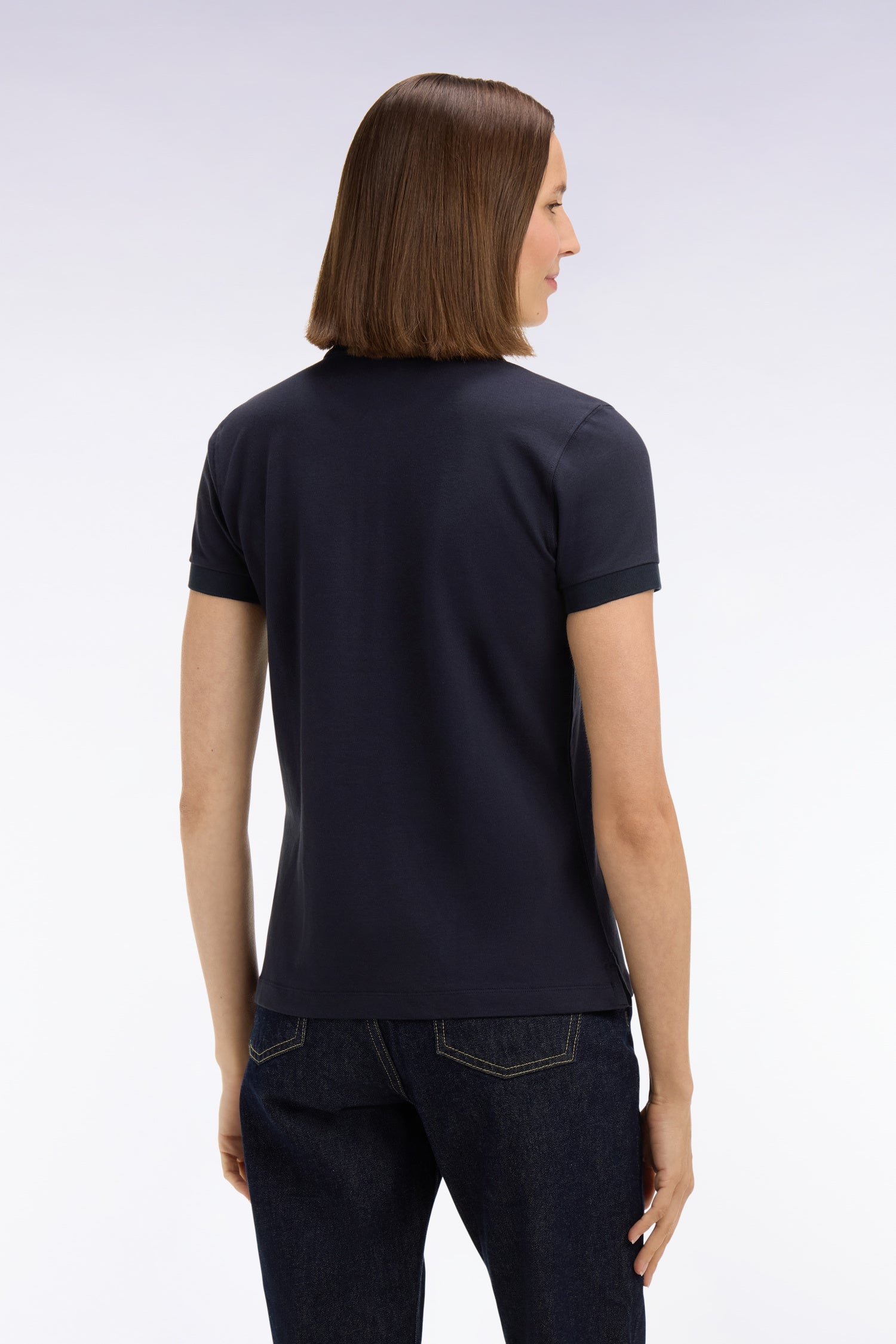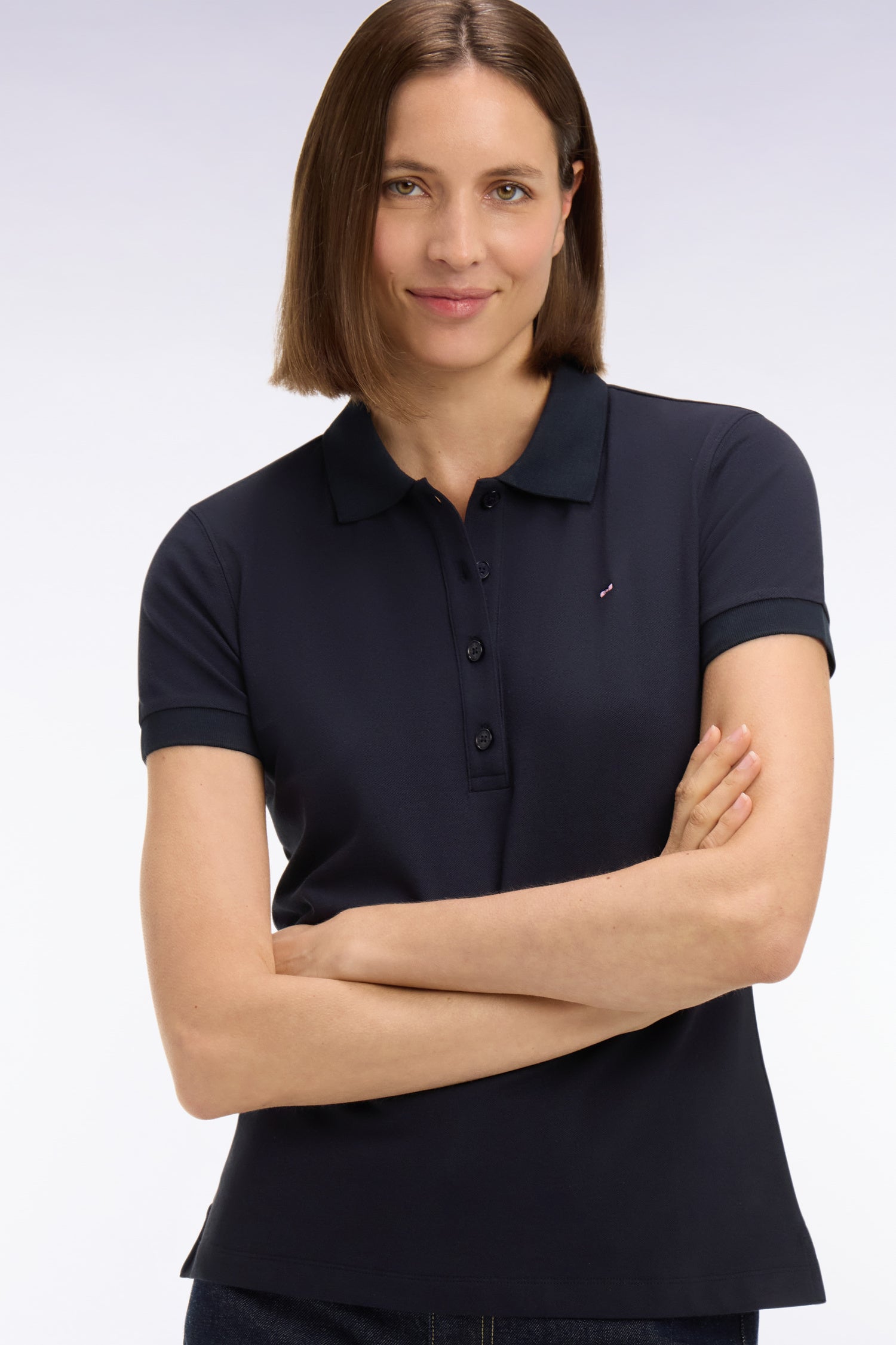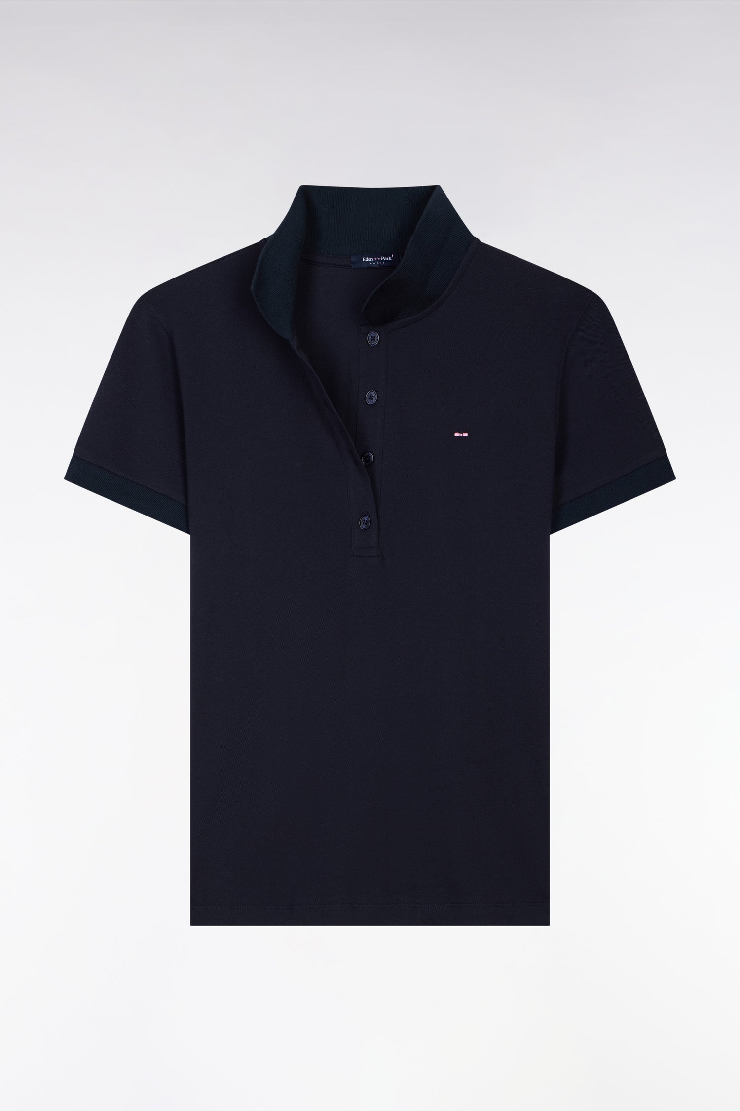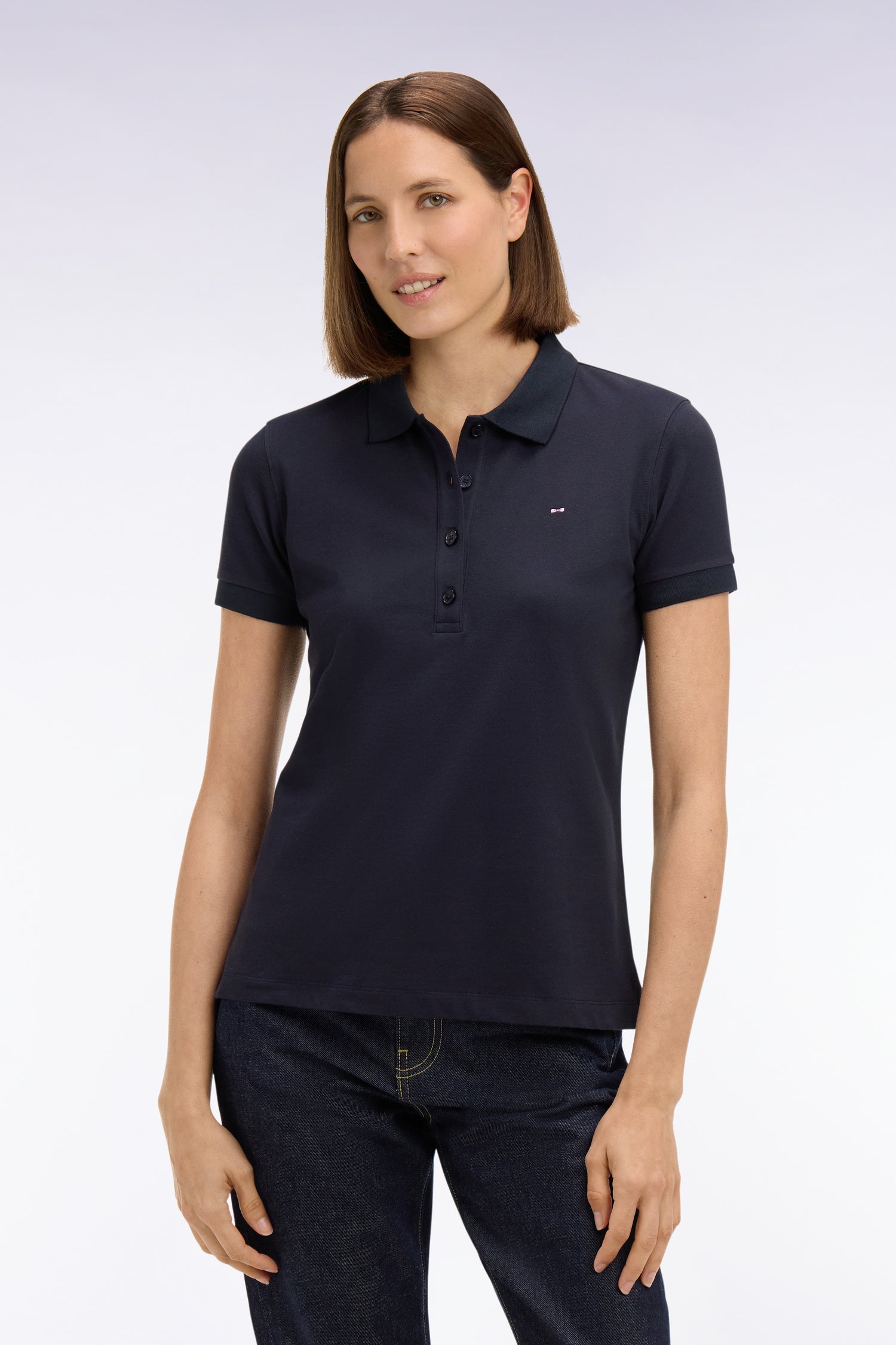 Ce polo femme à manches courtes confectionné dans un coton stretch doux et léger est disponible en coloris blanc, marine ou rose. Sa coupe slim plus cintrée assure une allure chic et sportive au quotidien. Ce modèle iconique arbore notre broderie signature : l'emblème nœud papillon Eden Park.
