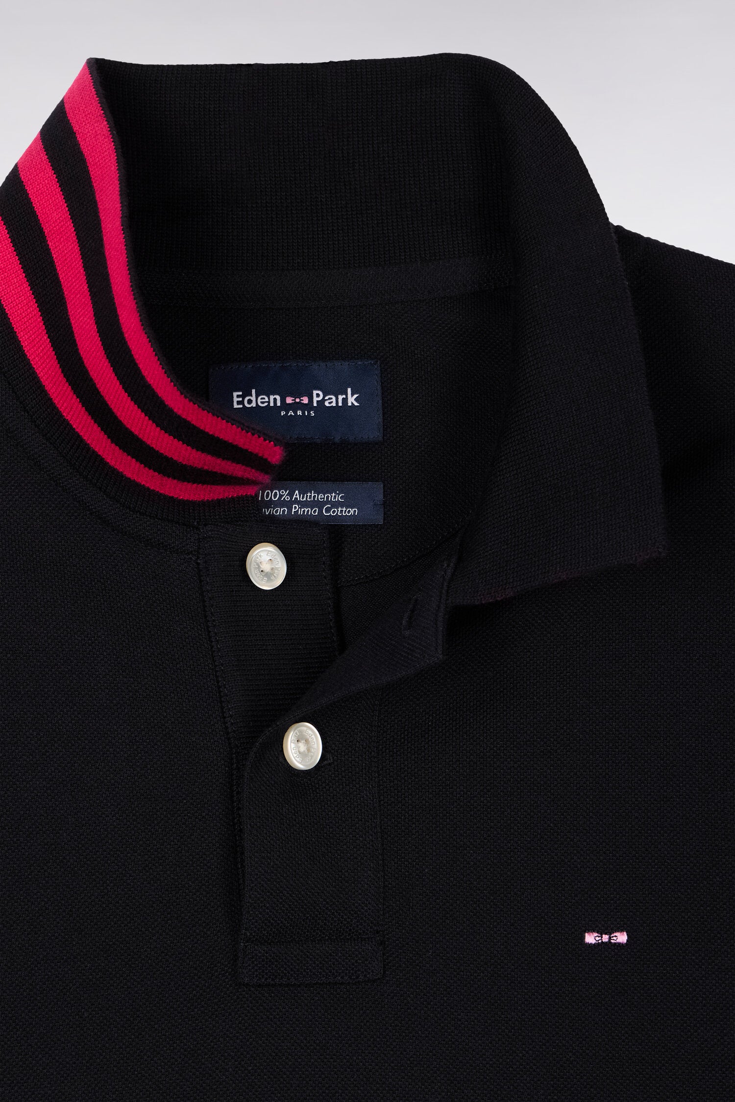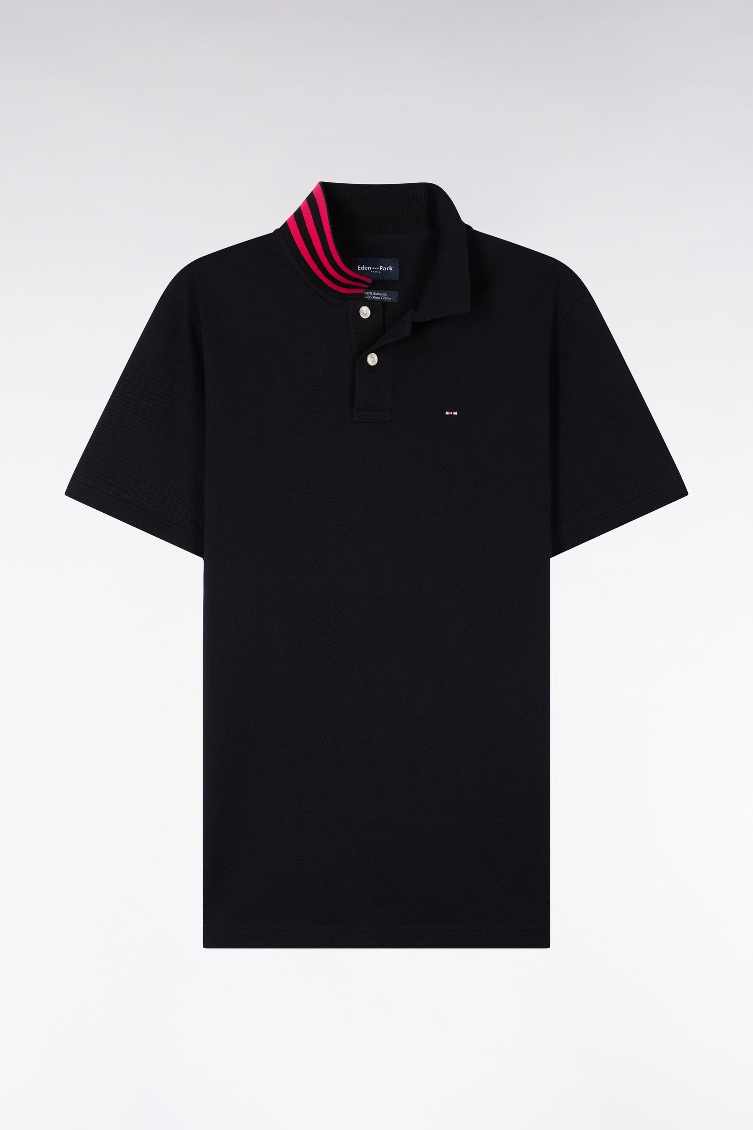 Polo manches courtes en piqué coton noir dessous de col rayé coupe slim