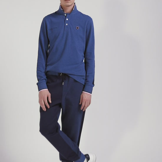 Polo manches longues en piqué coton bleu foncé détails tricolores coupe Regular