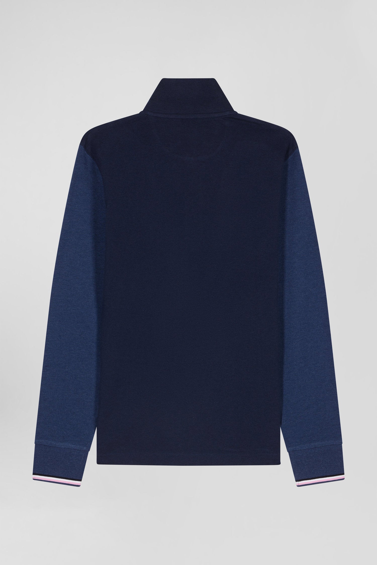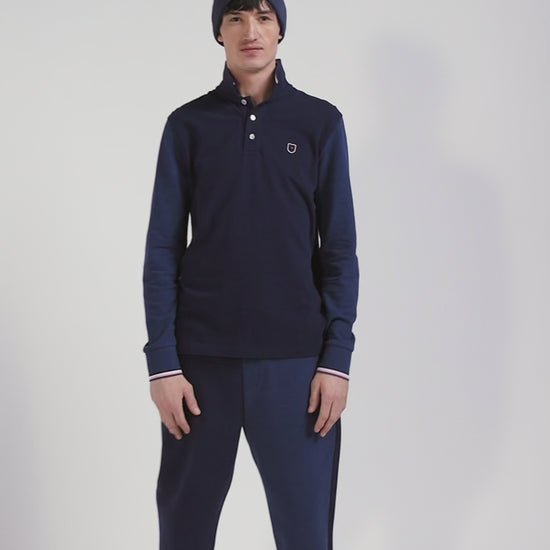 Polo manches longues en piqué coton bleu marine col jacquard écusson gomme coupe Regular