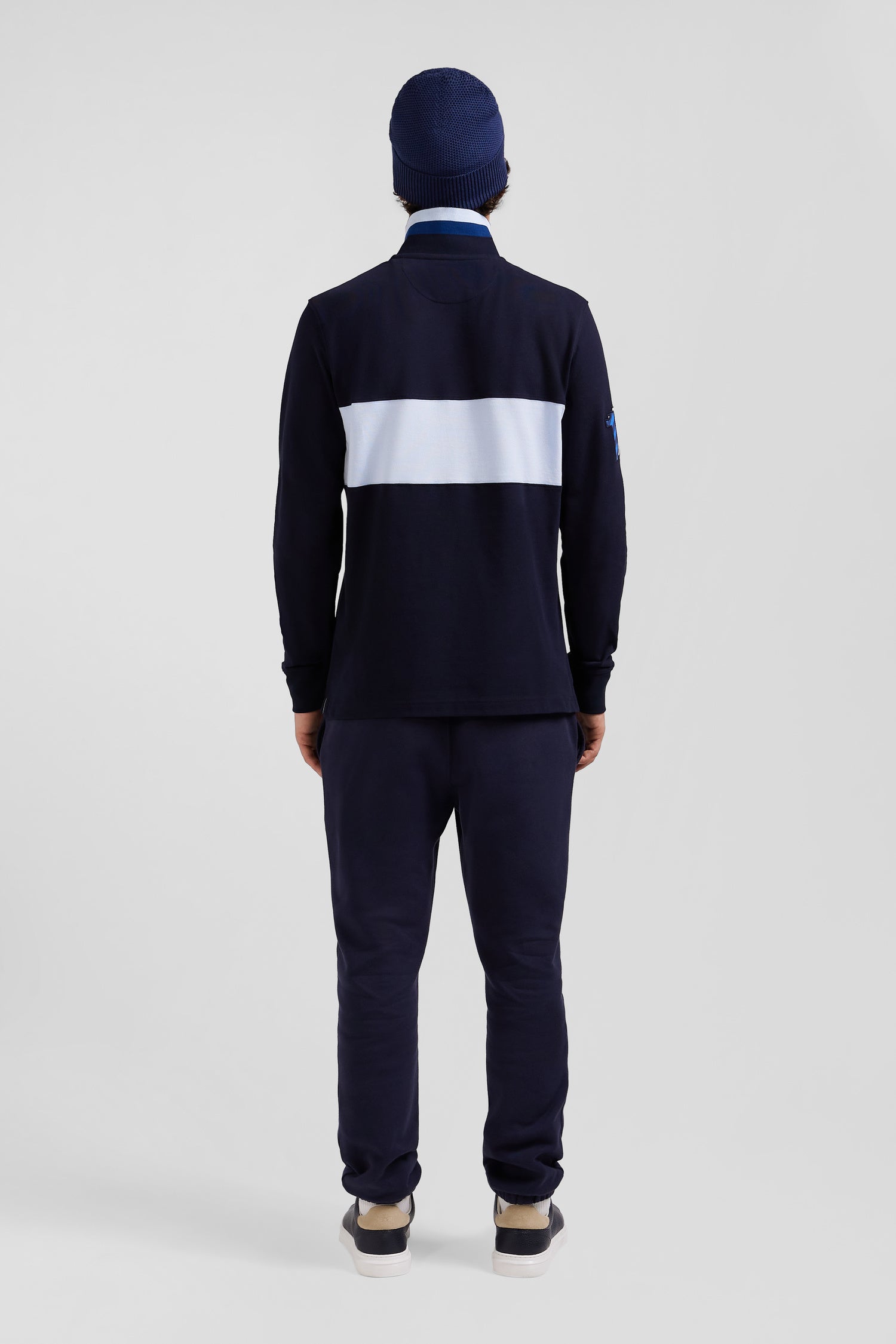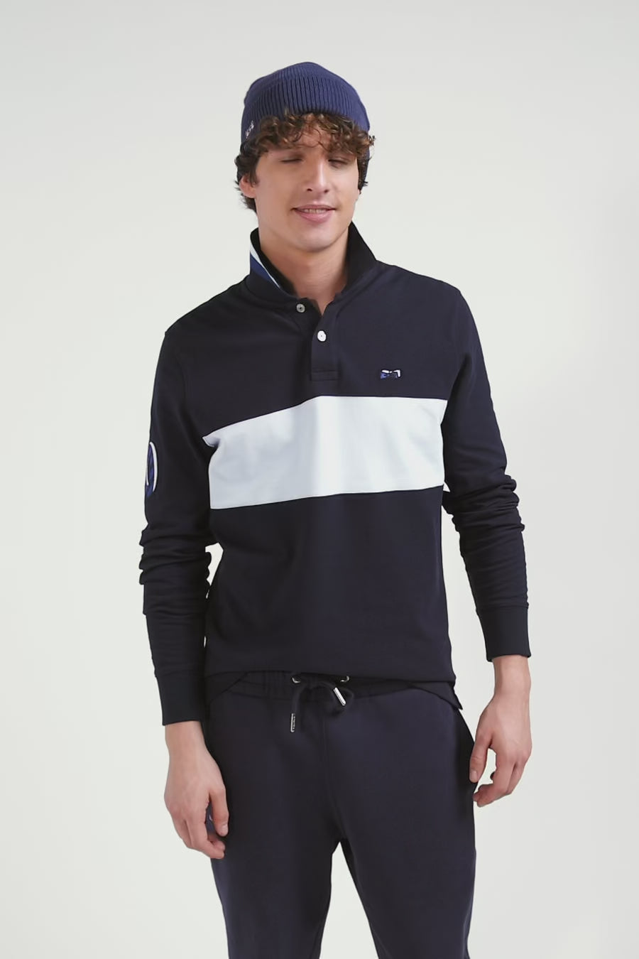 Apportez une touche travaillée à votre vestiaire décontracté avec ce polo manches longues masculin. Ses finitions brodées avec application de tissu cravate sur la manche lui confèrent une élégance certaine. Le numéro 10 choisi ne tient pas du hasard, il s'agit du maillot porté par le rugbyman et fondateur d'Eden Park Franck Mesnel. Les boutons ovales, inspirés du rugby et portant le nom de notre Maison s'ajoutent aux détails soignés de ce polo masculin comme son dessous de col tricoté arborant des rayures tricolores.