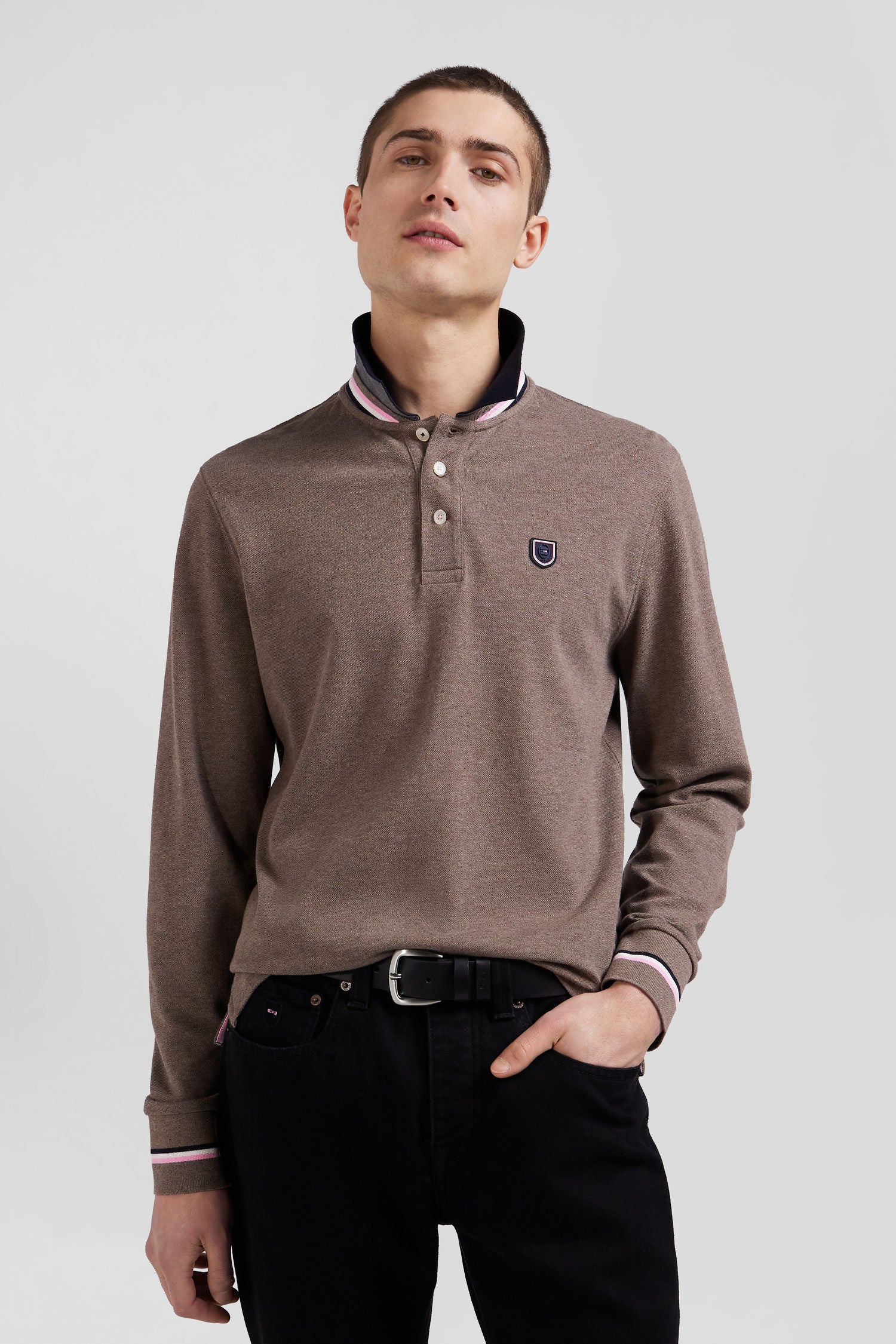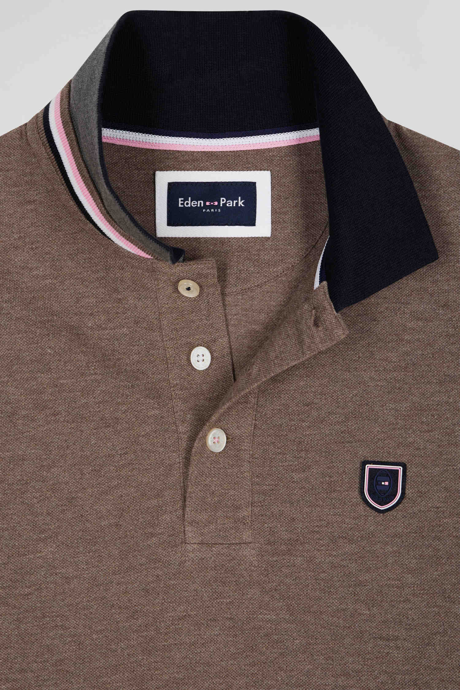 Polo manches longues en piqué coton marron écusson gomme coupe Regular