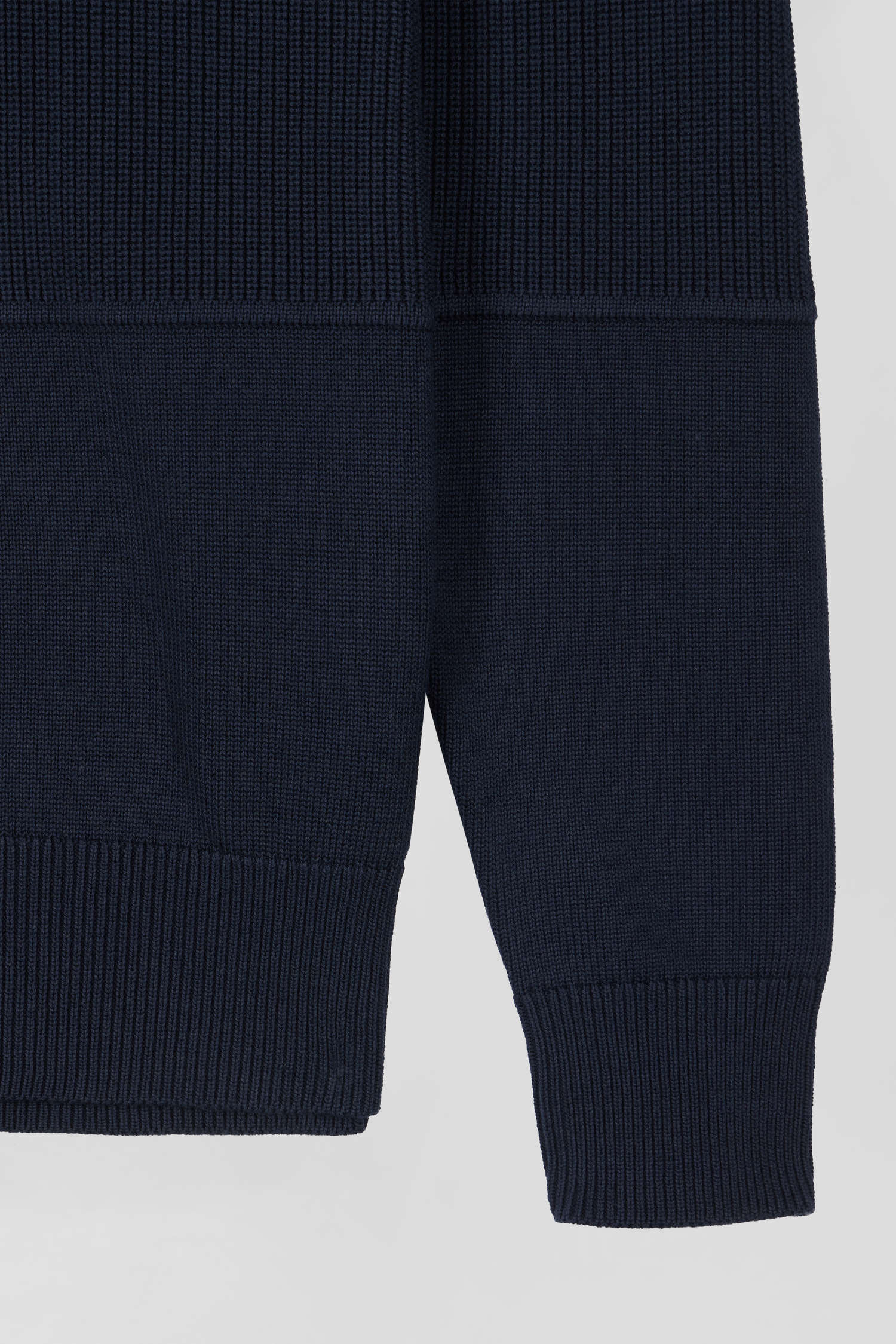 Élégance et originalité se fondent dans ce pull zippé à col camionneur. Ses rayures intérieures contrastées et la demi-lune en jersey sont rehaussées par un ruban tricoté tricolore, pour une touche discrète de sophistication. Le jeu des côtes perlées alternant avec le jersey crée un effet trompe-l’œil saisissant, évoquant un style coupé-cousu contemporain rendant hommage aux maillots de rugby et à leur confection particulière. Cet essentiel masculin revisité est parfait pour une allure raffinée et décontractée à la fois.