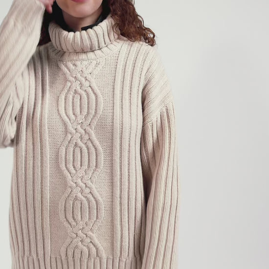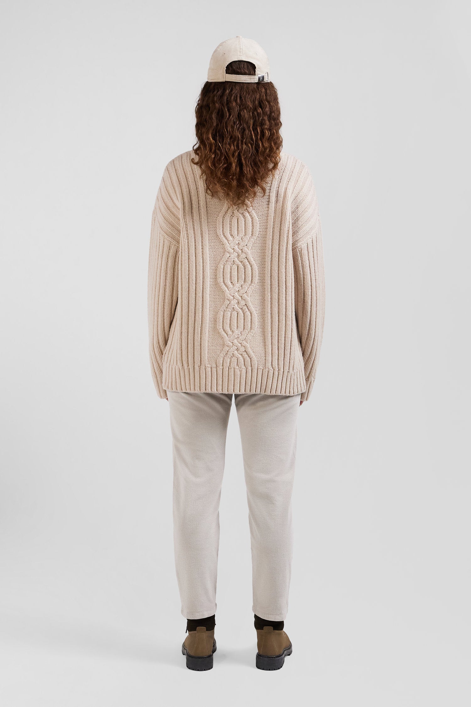 Majoritairement composé de laine vierge, ce pull femme à col cheminée vous promet un porté chaud et confortable pour la saison automne-hiver. Son tricotage soigné permet de créer un effet de nœud en relief, rappel subtil de notre emblème. Grâce à sa coupe Oversized, ce pull d'hiver couleur ivoire facilite vos jeux de superposition tout en vous offrant une silhouette tendance pour une tenue cosy et travaillée structurée par ses bords-côtes tricotés. Jean ou pantalon de costume s'y accorderont à la perfection.