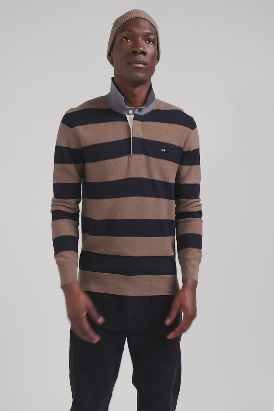 Ce pull cerclé est confectionné dans un mélange doux de coton et de cachemire. Avec son col typique de maillot de rugby et une plaquette de boutonnage doublée d'un ruban blanc, ce pull homme allie confort et style. L'effet de points contrastés sur les rayures bicolores ajoute une touche d'originalité, tandis que l'alternance de jersey et de point Ottoman offre une texture variée et attrayante. Ce pull d'hiver est parfait pour un look sophistiqué au twist sportif.