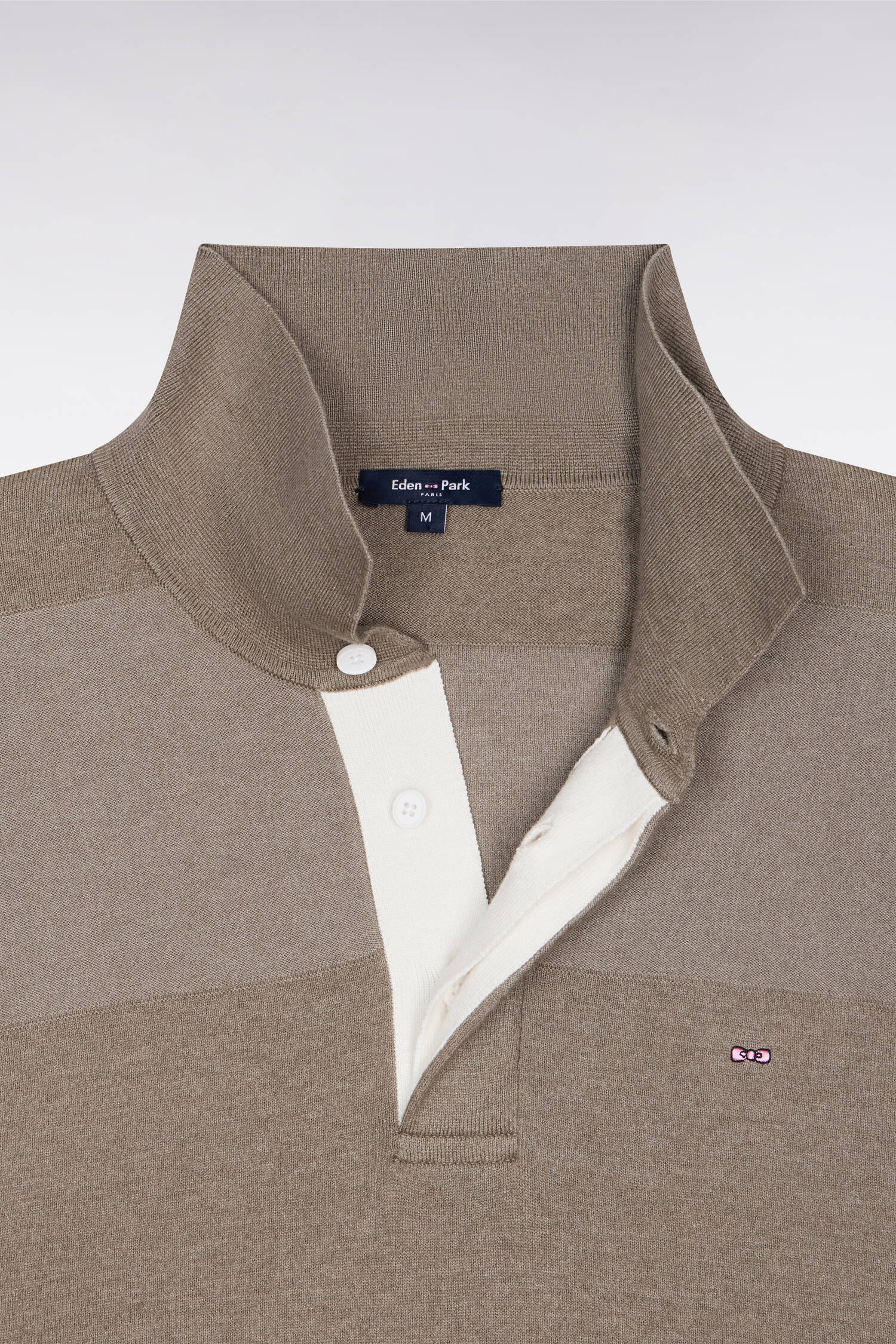 Dans son association de rayures beige et kaki inspirées des maillots de rugby belges, ce pull col maillot déclare avec élégance notre héritage rugby. Le passage d'un point jersey au point jersey envers se fait subtilement via des surpiqûres de liaison créant ces élégantes rayures à même la matière. Sa plaquette de boutonnage est réalisée en ruban chevron blanc pour plus d'élégance.