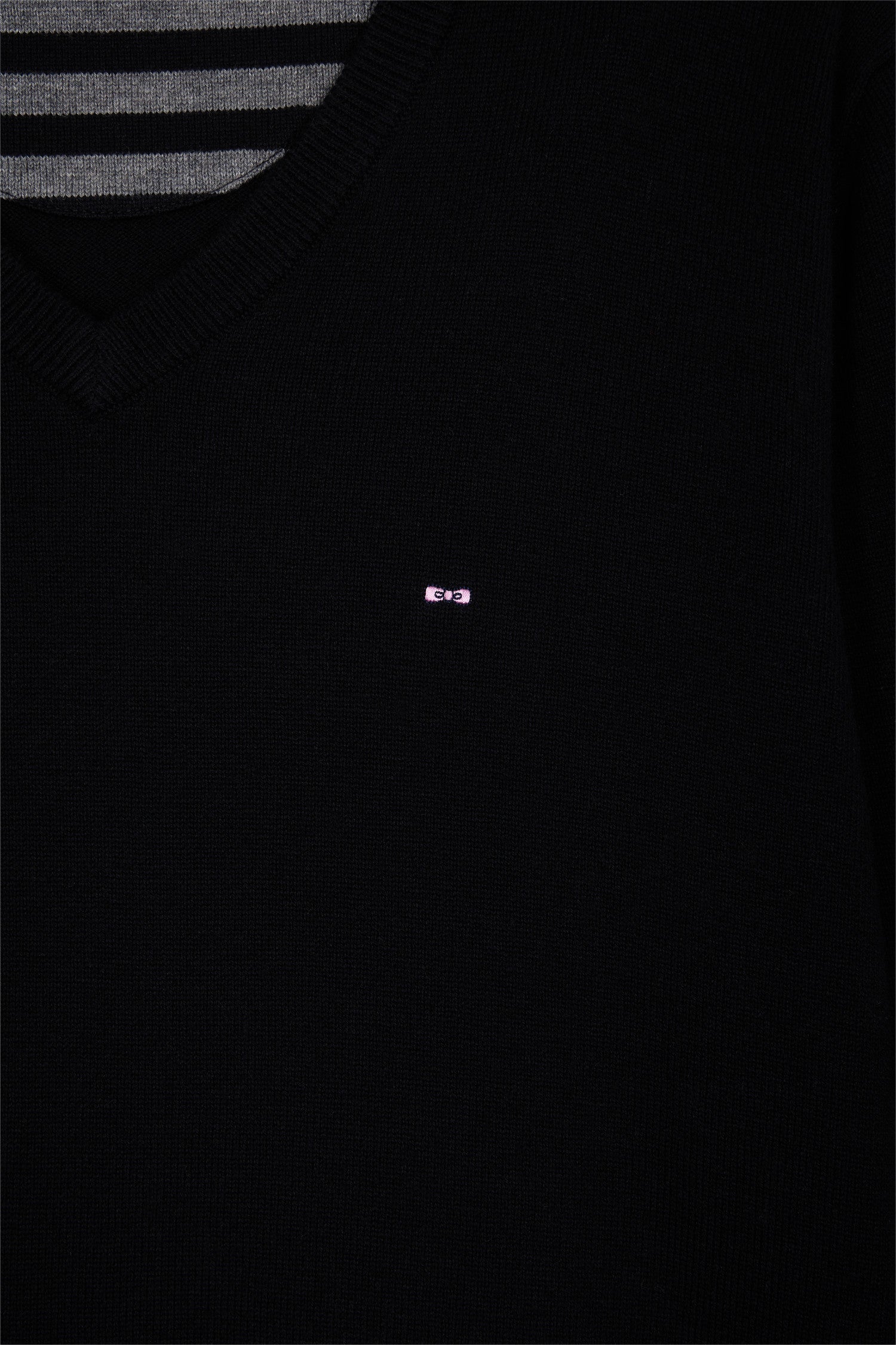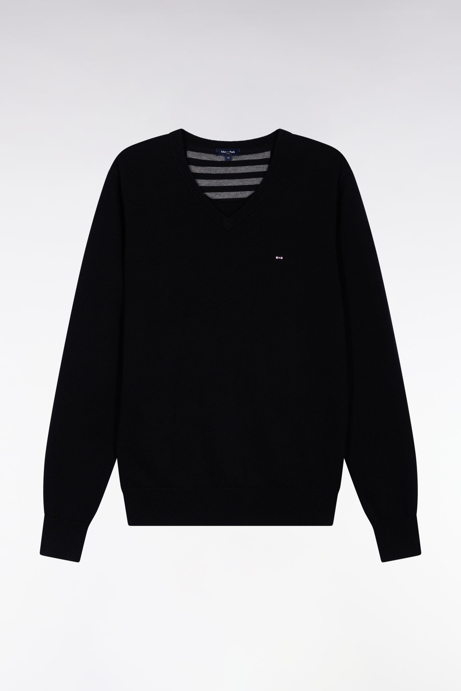 Cet élégant pull col V en laine et coton mélangés reprend la coupe droite confortable et polyvalente de notre pull classique décliné dans plusieurs propositions se distinguant par leur encolure. Ce modèle se pare de notre emblématique broderie nœud papillon sur la poitrine et d'une demi-lune intérieure à rayures rugby. Parfait pour dynamiser une silhouette avec une touche de couleur maîtrisée grâce au large choix de coloris proposés ici