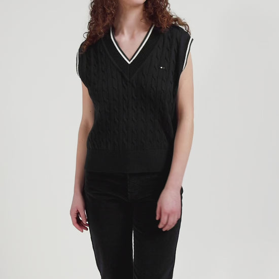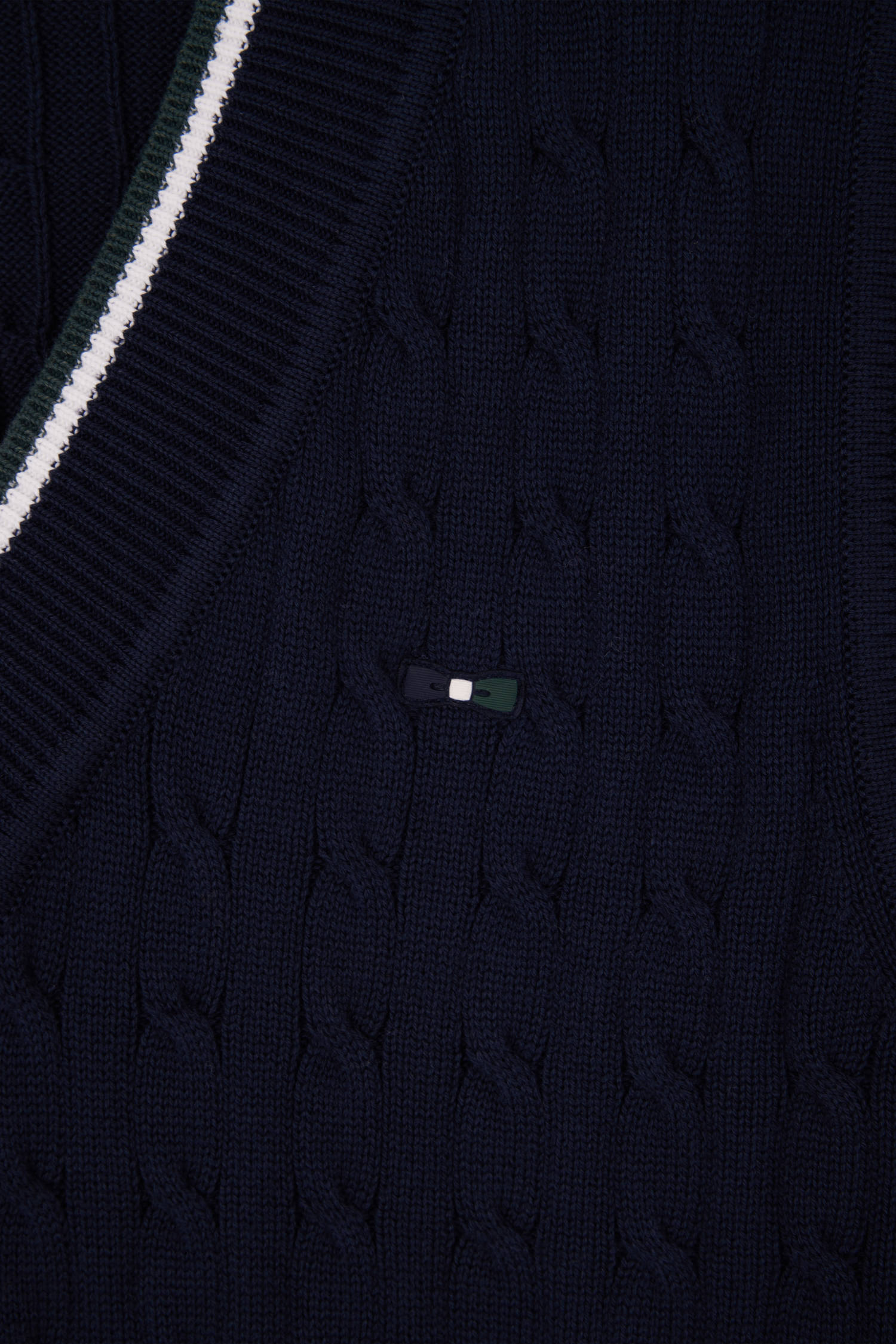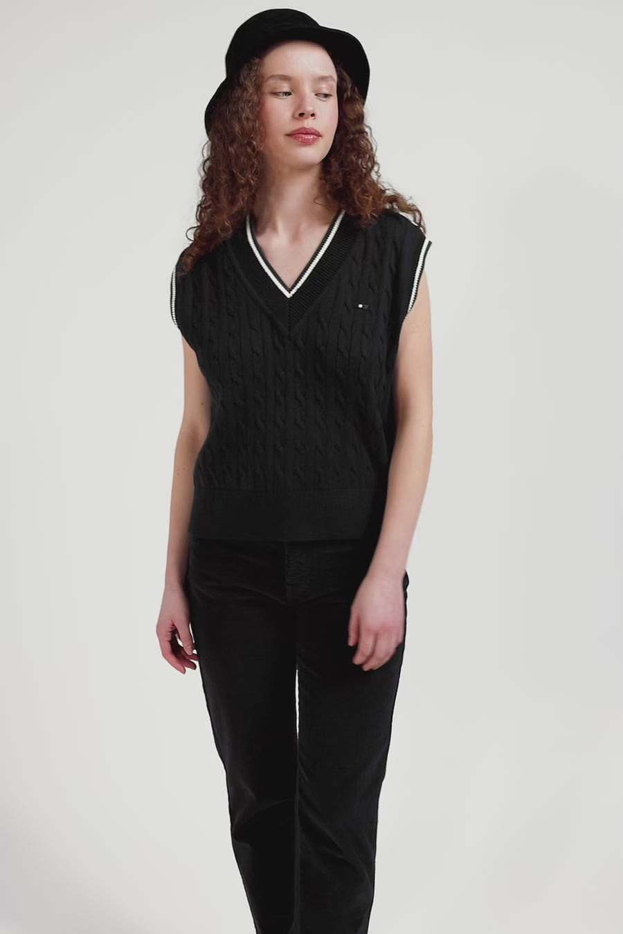 Optez pour un look sport chic avec notre pull sans manches à torsades pour femme, parfait en superposition ou porté seul. Ce modèle présente un élégant liseré contrasté au col V et aux bordures de manches, ajoutant une touche de raffinement. Les torsades classiques offrent un jeu de texture, faisant de ce pull sans manches un essentiel, idéal sur une chemise pour une allure sophistiquée ou à même la peau pour une tenue tendance.