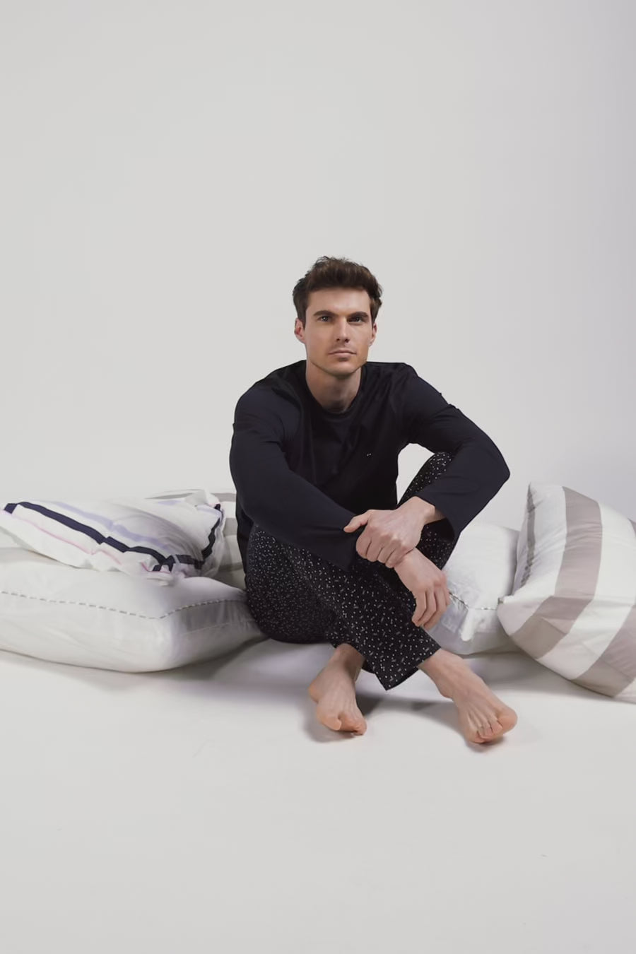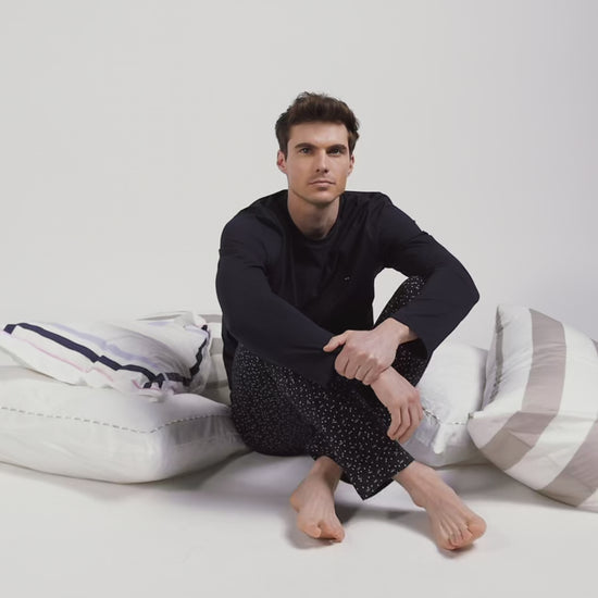Notre élégant ensemble pyjama marine s'avère idéal pour les moments de détente. Le pantalon en coton présente un micromotif graphique et une taille élastiquée pour un confort optimal, accompagné d'un T-shirt à manches longues, simple et raffiné, ce pyjama promet des nuits douces et tendance.
