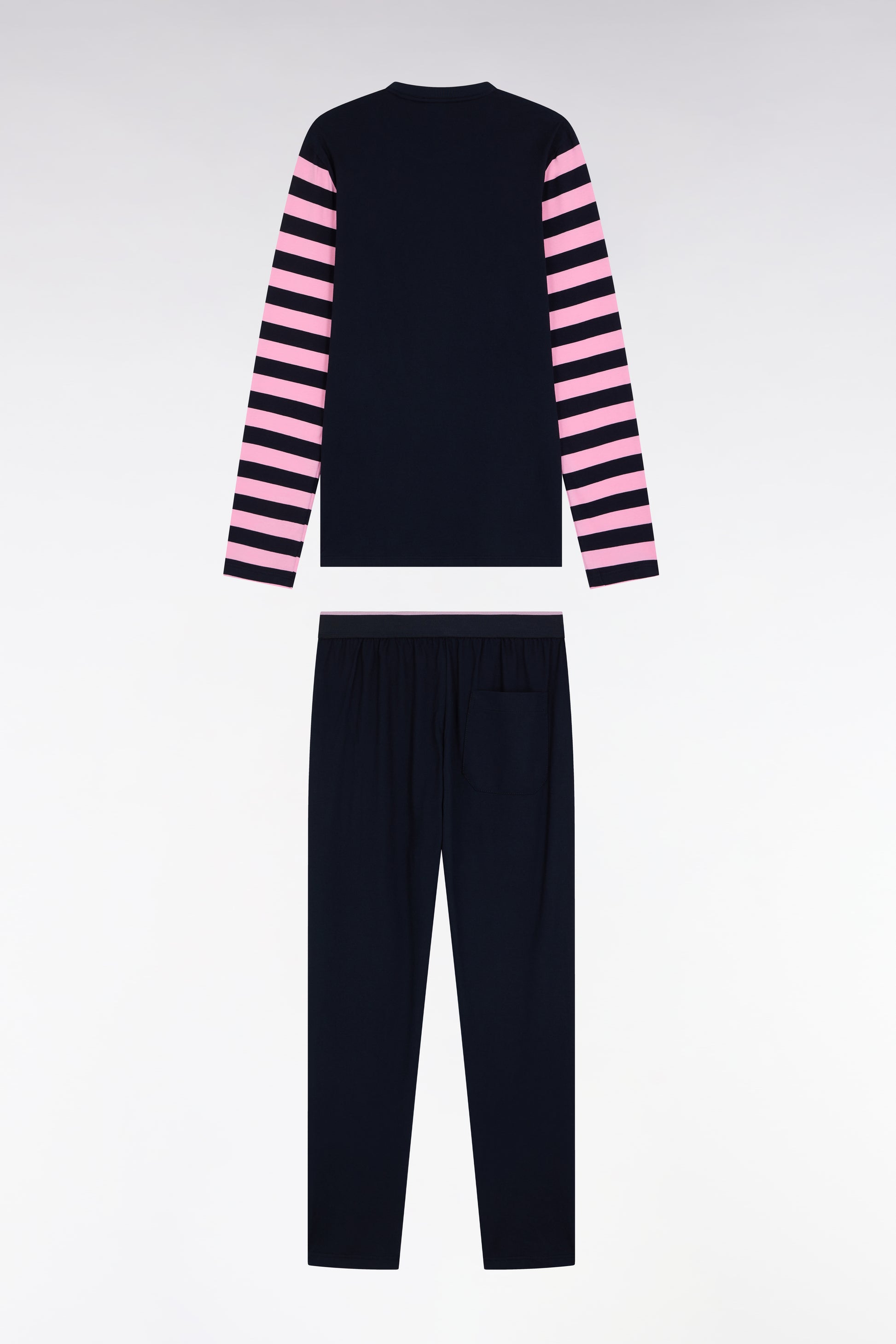 Ce pyjama long revisite l’esprit rugby des collections Eden Park avec un T-shirt manches longues aux manches à rayures roses. Son haut à col rond se coordonne à un pantalon uni à taille élastiquée griffé du logo de notre maison. Confectionné en jersey doux, il offre confort et caractère pour des nuits paisibles