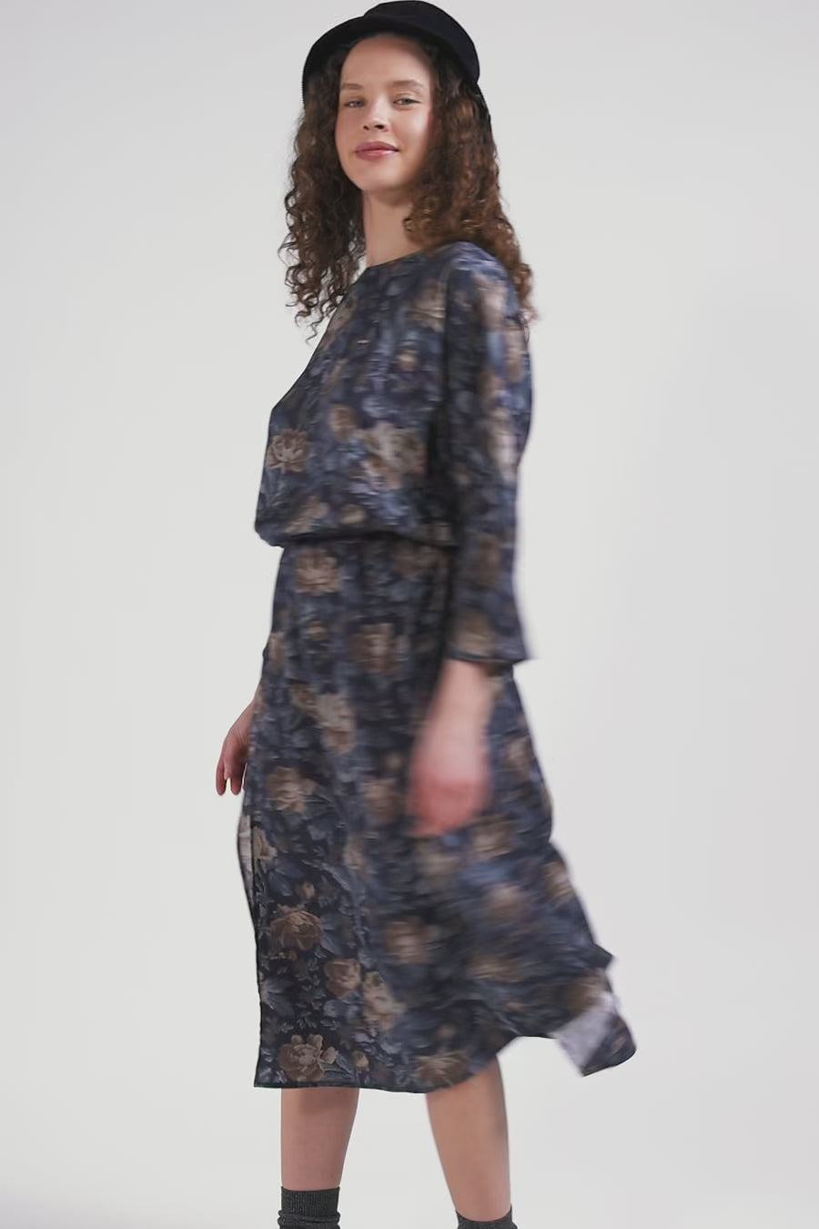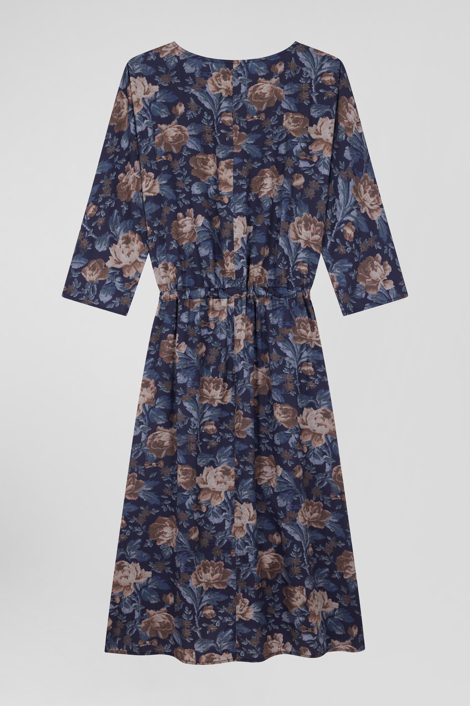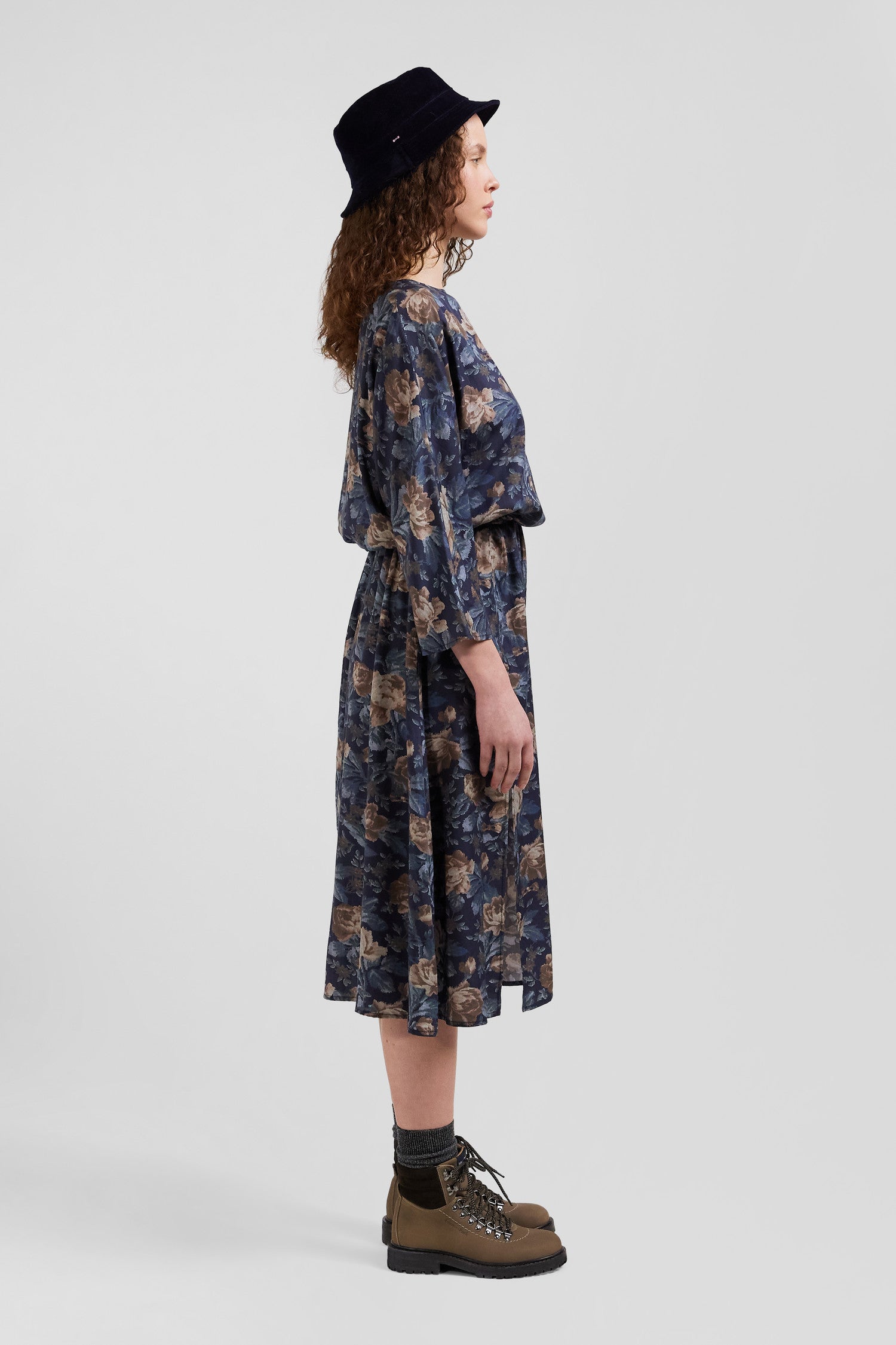 Robe en lyocell bleu marine manches longues à imprimé floral