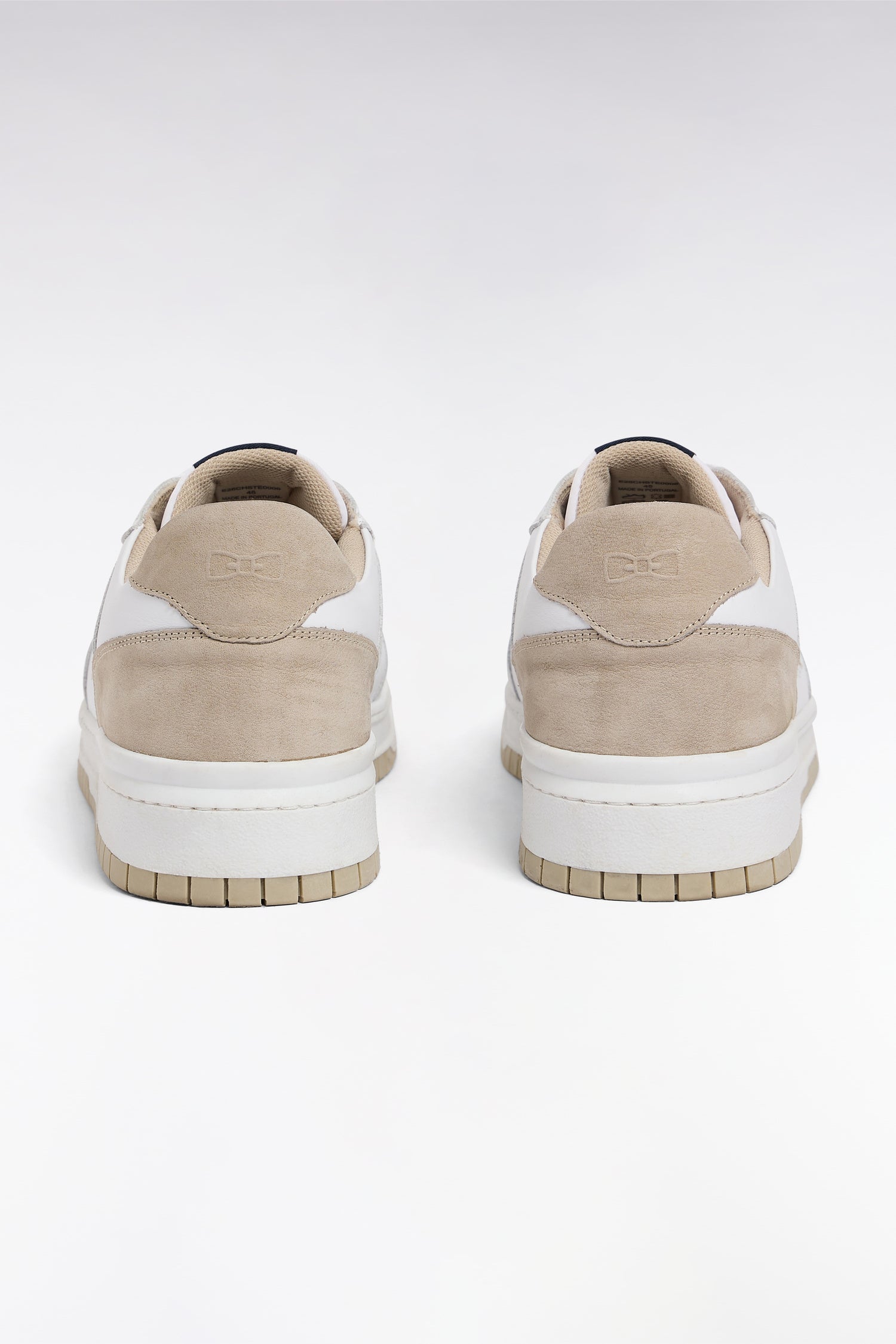 Cette paire de basket basse joue sur un subtil contraste de matières en associant le cuir lisse blanc et le cuir suédé de couleur beige pour une silhouette à la fois moderne et élégante. Les empiècements en cuir suédé et leur découpe rappelant notre emblème, le nœud papillon, apportent du relief et une touche authentique, tandis que la semelle structurée assure confort et stabilité au quotidien. Déclinées en deux coloris, ces sneakers s’adaptent facilement à différents styles, du jean décontracté au chino plus habillé. Une paire polyvalente, pensée pour enrichir le vestiaire masculin.