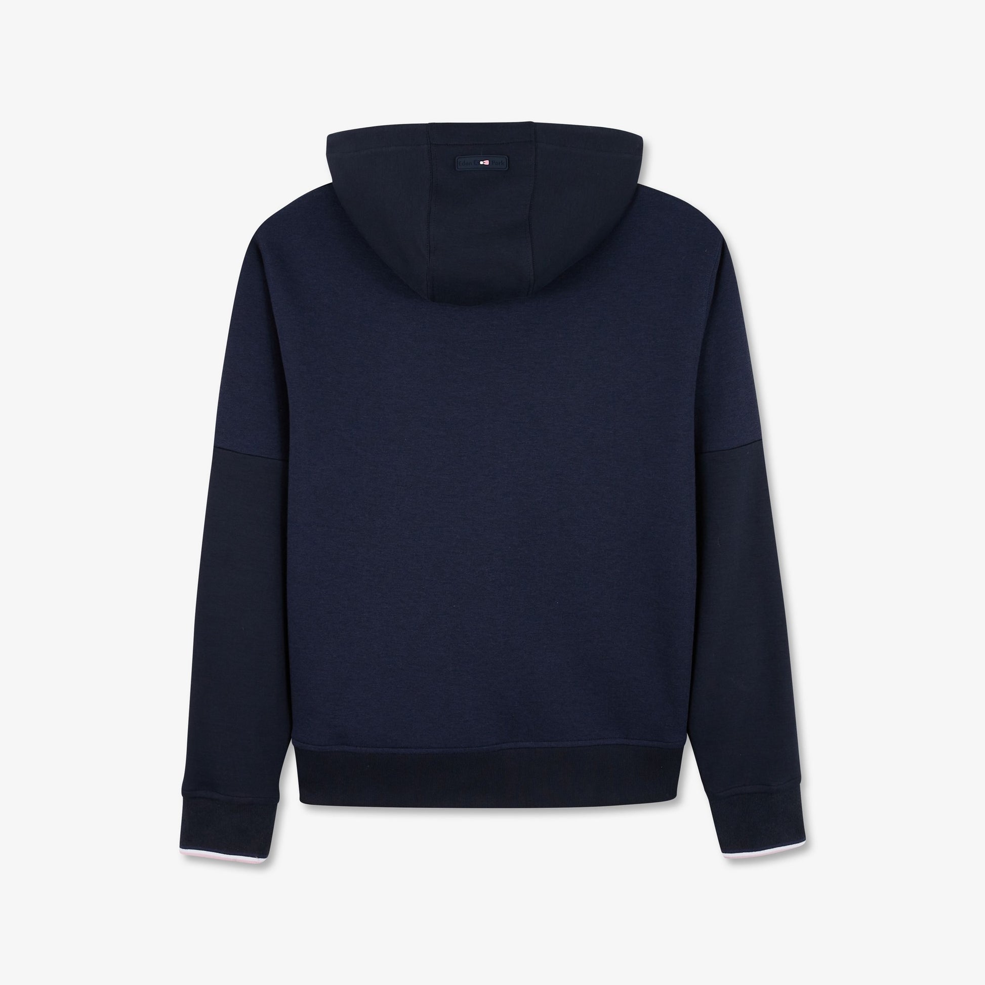Ce sweat à capuche garantit confort et résistance grâce à sa confection en coton épais avec des empiècements déperlants sur le devant. Il est doté d'une fermeture et de poches zippées et affiche un badge logo écusson sur la poitrine. On note les bandes tricolores au niveau des épaules et le haut des manches
