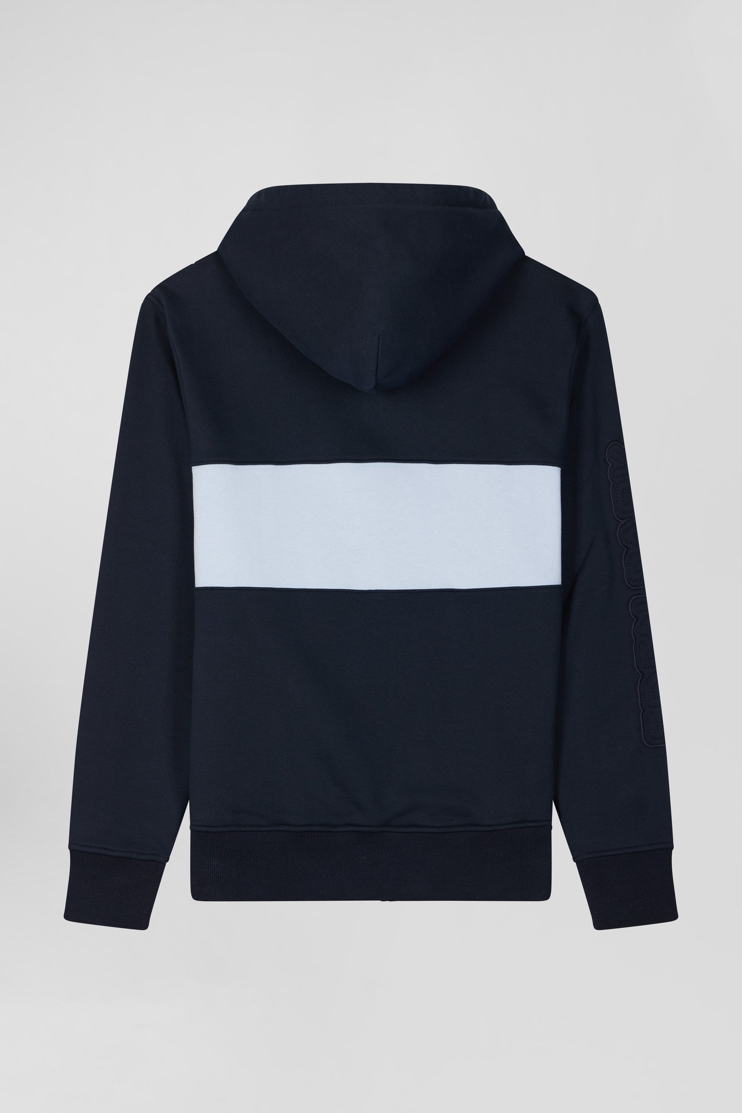 Ce sweatshirt à capuche zippé en molleton gratté combine confort et style avec sa bande poitrine originale et sa broderie matelassée sur la manche. L'intérieur gris chiné de la capuche apporte une touche contrastée, complétée par des finitions métalliques aux cordons de réglage de sa capuche et une bande de propreté en jersey coloré pour une allure contemporaine.