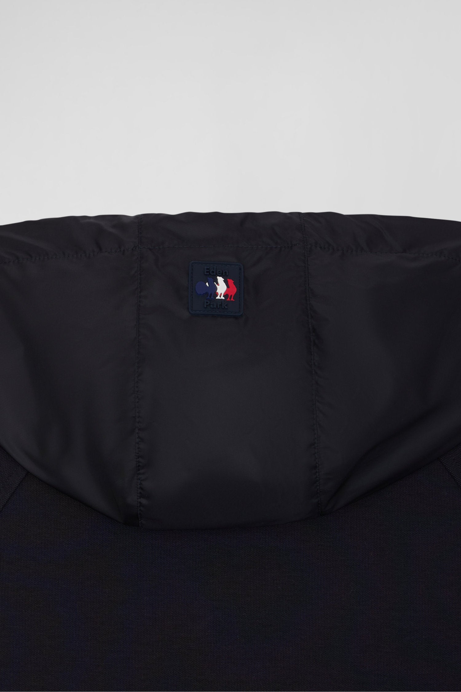 Embrassez l'esprit d'équipe avec ce sweat à capuche zippé aux couleurs d'Eden Park et du XV de France. En bleu marine et gris, il est rehaussé de détails roses, signature de notre Maison. L'intérieur de capuche arbore des rayures tricolores, tandis que broderies fines et badges en gomme signent l'allure avec une élégance sportive.