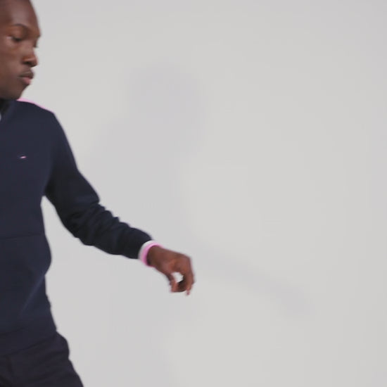 Notre sweatshirt homme en coton est conçu en partenariat avec le XV de France. Ce modèle marine présente un col de maillot de rugby classique, et se distingue par une broderie emblématique du coq du XV de France sur le dos. Les épaules sont ornées de rayures tricolores bleues, blanches et roses. Parfait pour les amateurs de rugby comme de mode, ce sweatshirt à poche kangourou est un incontournable pour soutenir votre équipe préférée avec style.