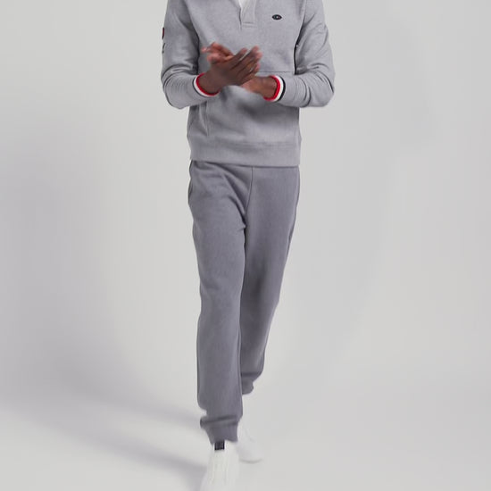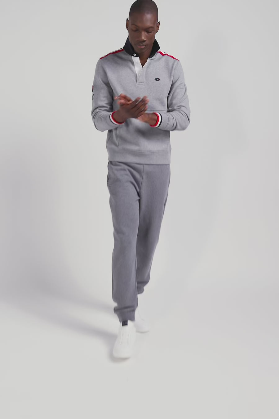 Ce sweatshirt en coton gris chiné est conçu en collaboration avec le XV de France. Ce modèle présente un col de maillot de rugby et est orné d'une broderie du coq français iconique sur le dos. Les épaules sont rehaussées par des rayures bleu, blanc et rouge, ajoutant une touche sportive moderne. Parfait pour les amateurs de rugby et les adeptes de la mode, ce sweatshirt avec poche kangourou assure un look décontracté et tendance.
