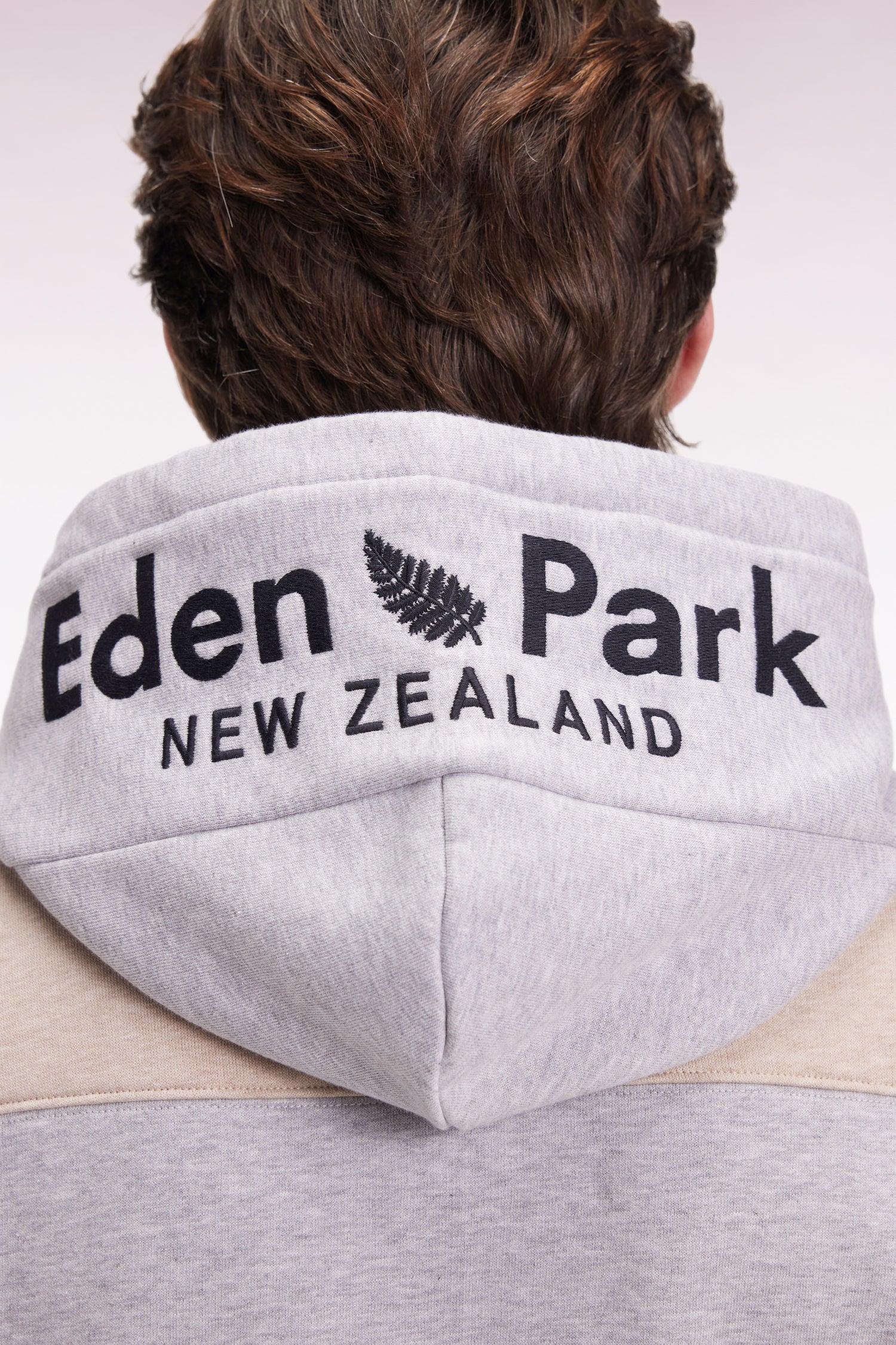 Pièce forte du vestiaire décontracté, ce sweatshirt à capuche rend hommage à la Nouvelle-Zélande, terre emblématique du rugby. Décliné en 2 associations, beige et gris clair ou noir et gris foncé, il s’inspire du maillot de rugby à bandes pour une silhouette graphique. Broderie numéro 10, écusson emblématique et cordons siglés viennent affirmer l’ADN Eden Park