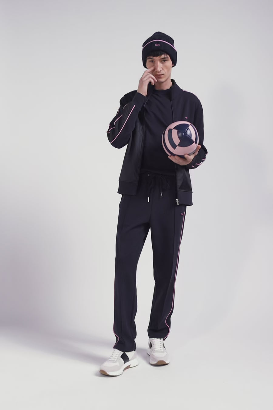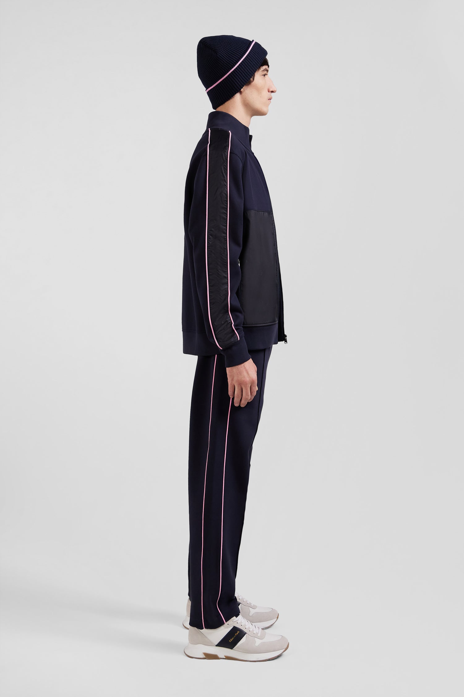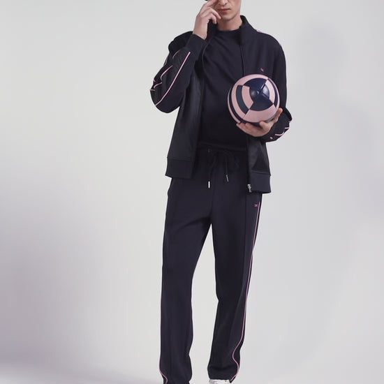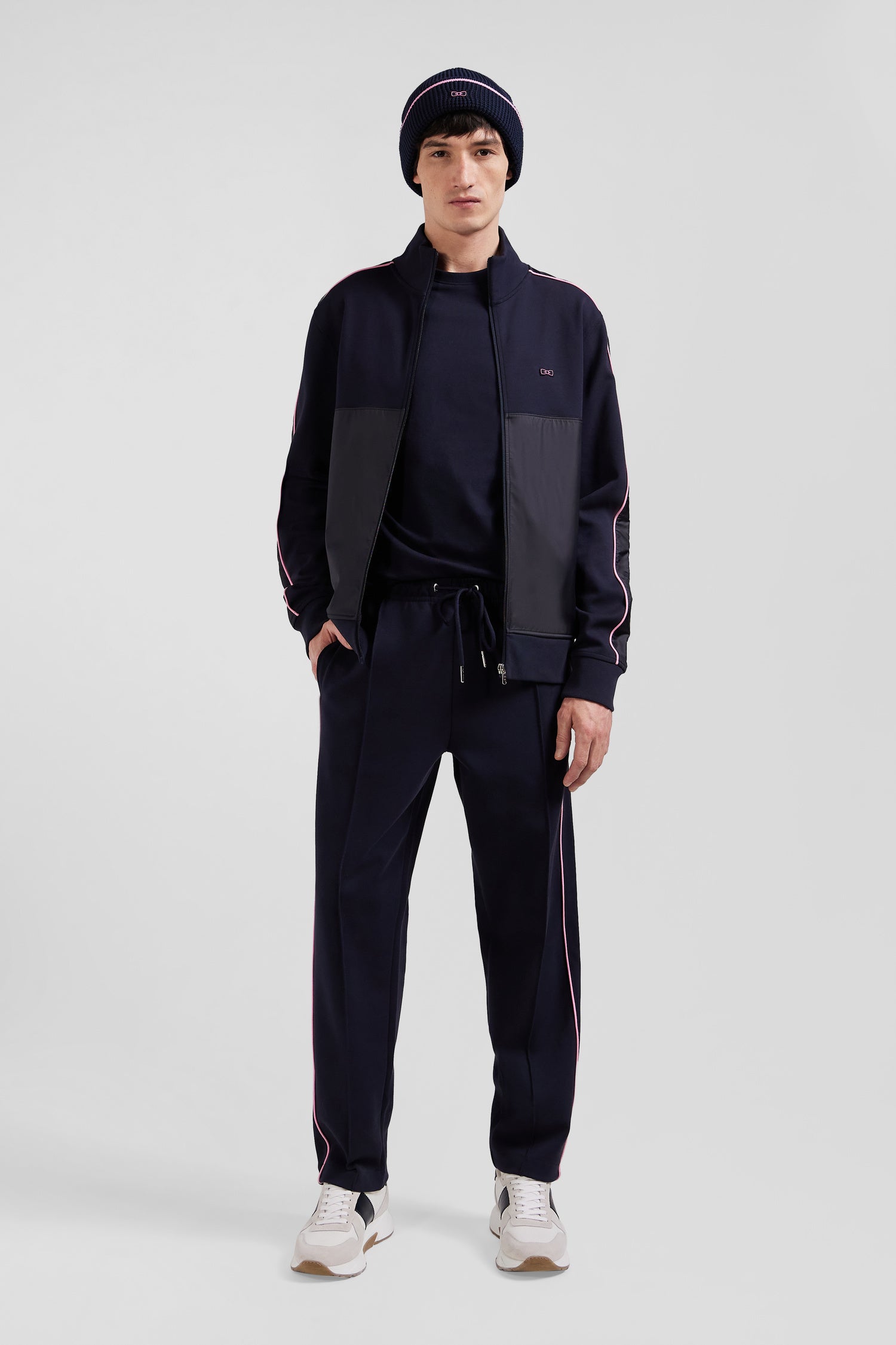 Ce sweatshirt zippé col montant en interlock se distingue par ses empiècements en nylon sur les manches et le devant, accentués de passepoils roses élégants. Son col montant zippé et ses finitions métalliques argentées siglées au nom de notre Maison ajoutent une touche de raffinement à ce vêtement moderne et fonctionnel.