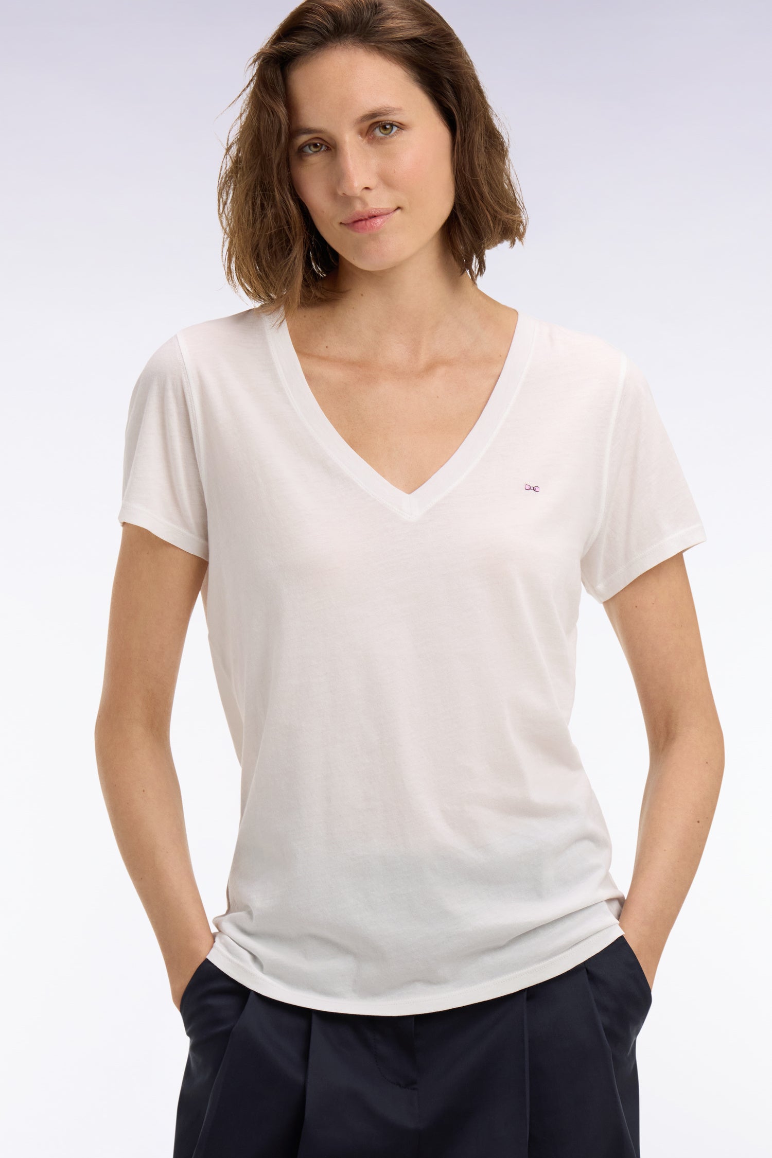 Ce T-shirt femme à manches courtes en coton Pima offre un porter doux et confortable saison après saison. Léger, respirant et thermorégulateur, le coton Pima écoresponsable est parfait pour l’été. Disponible en trois coloris intemporel, ce T-shirt à col V s’adapte à toutes vos tenues, des plus simples aux plus travaillées.