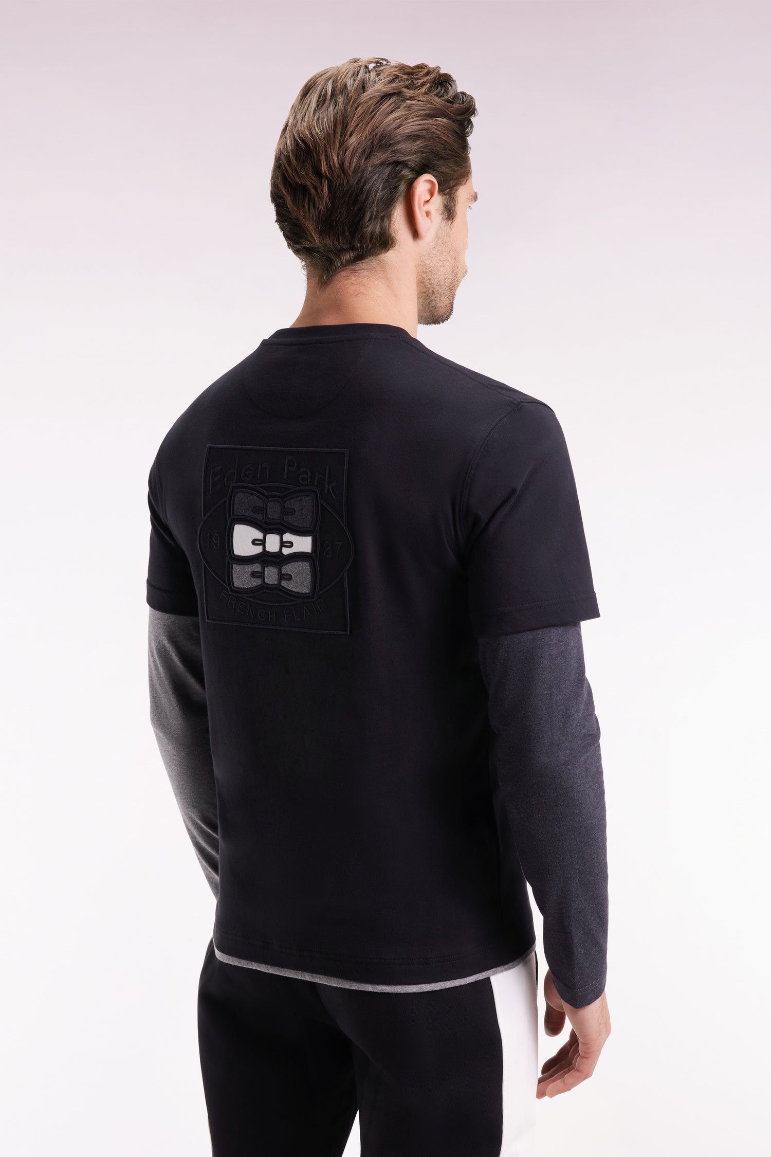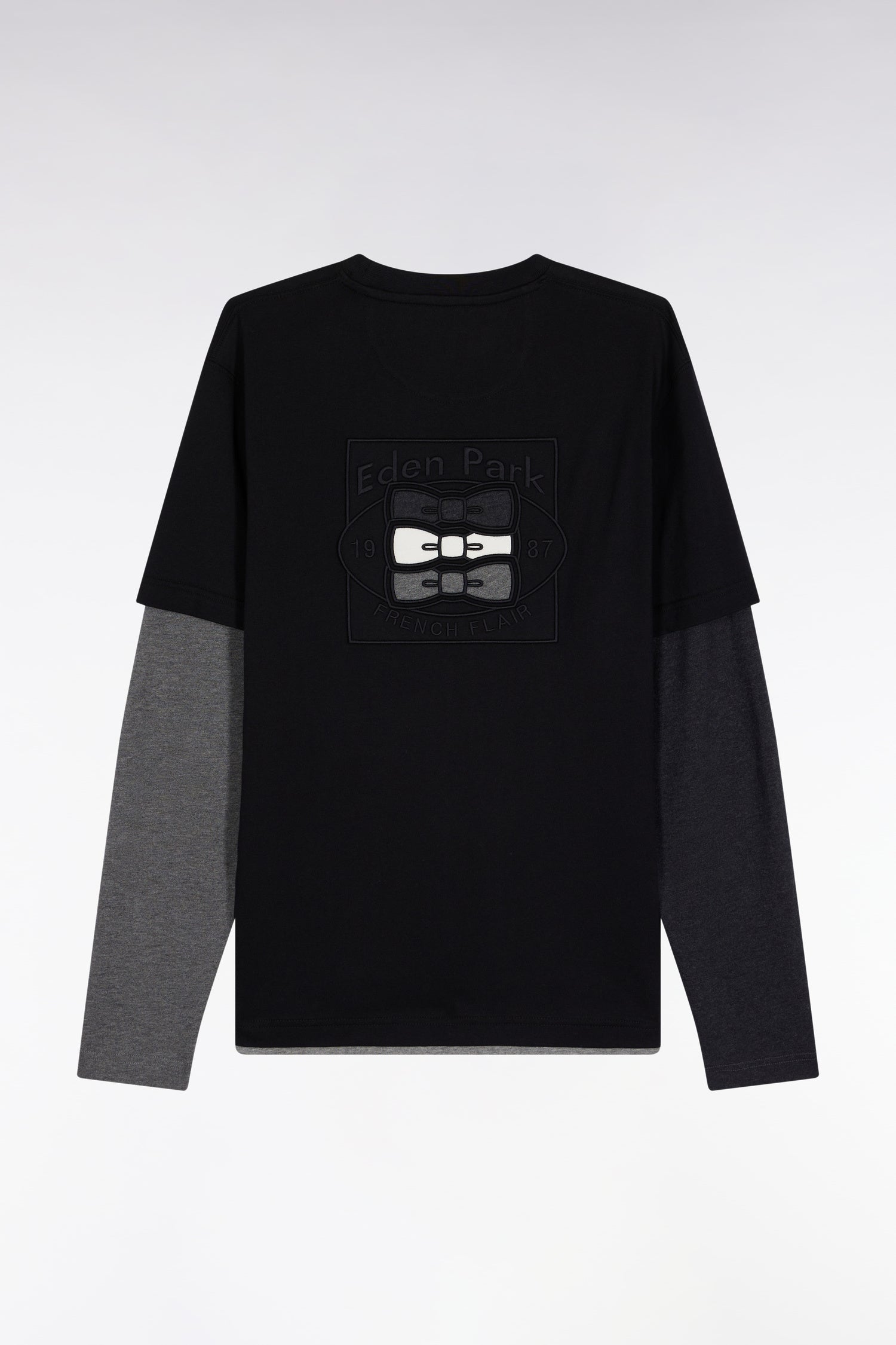 Appréciez le jeu de superpositions graphiques caractérisant ce T-shirt en jersey de coton, qui mixe des manches longues colorées, noires et grises ou ciel et roses selon le modèle choisi, à un corps uni noir ou marine. Un effet accentué par un bas de corps contrasté, son patch logo en silicone apposé sur la poitrine et sa broderie dos