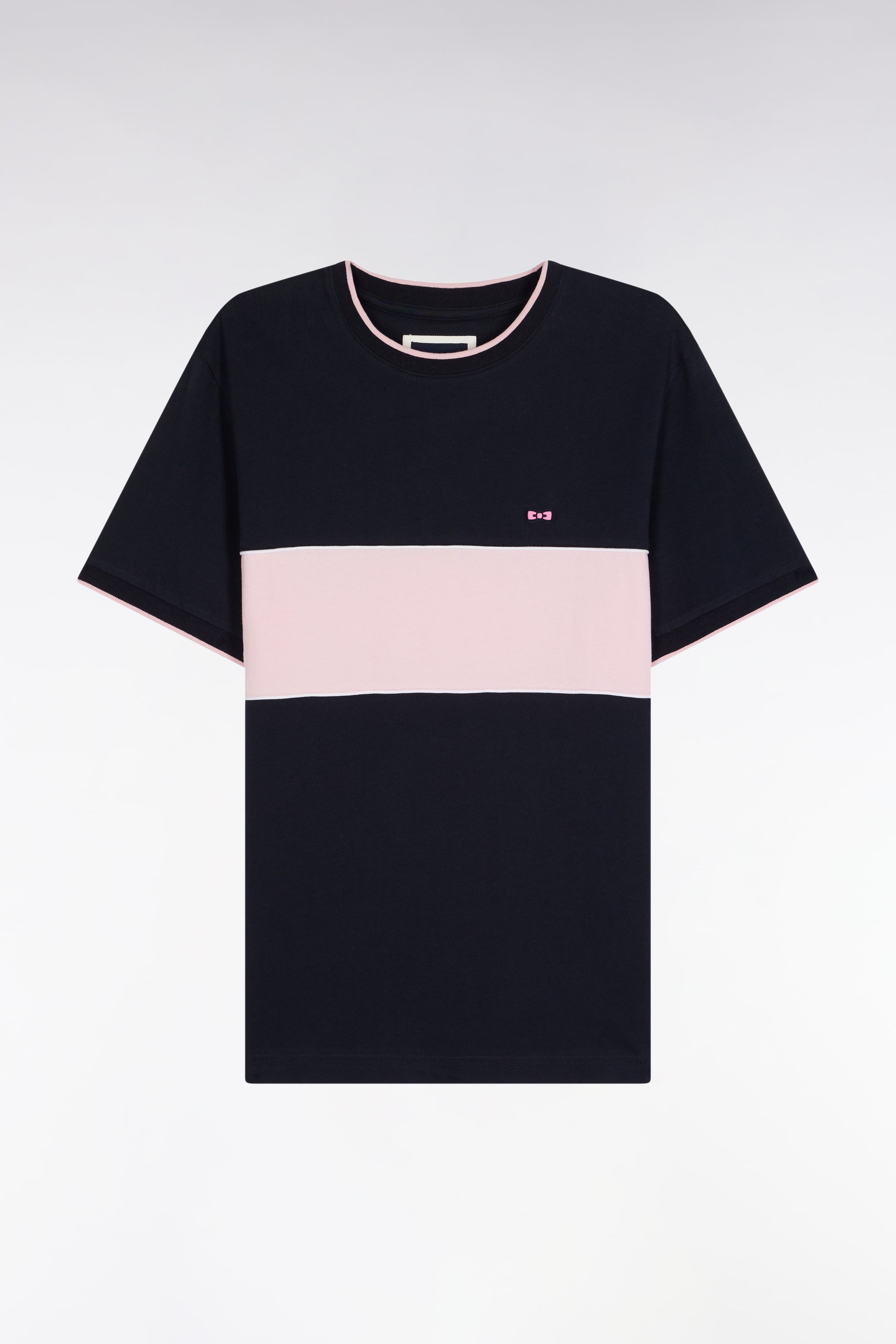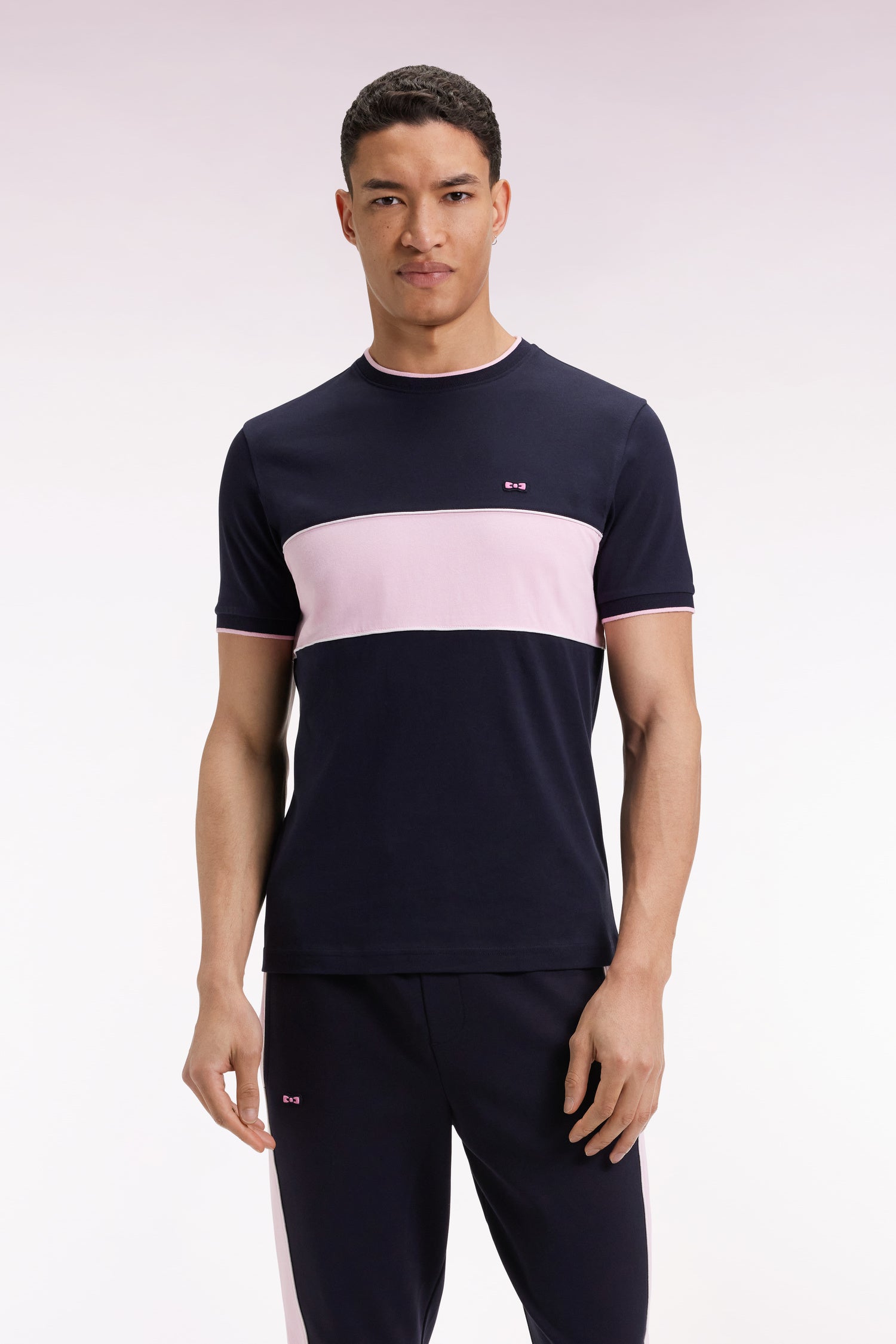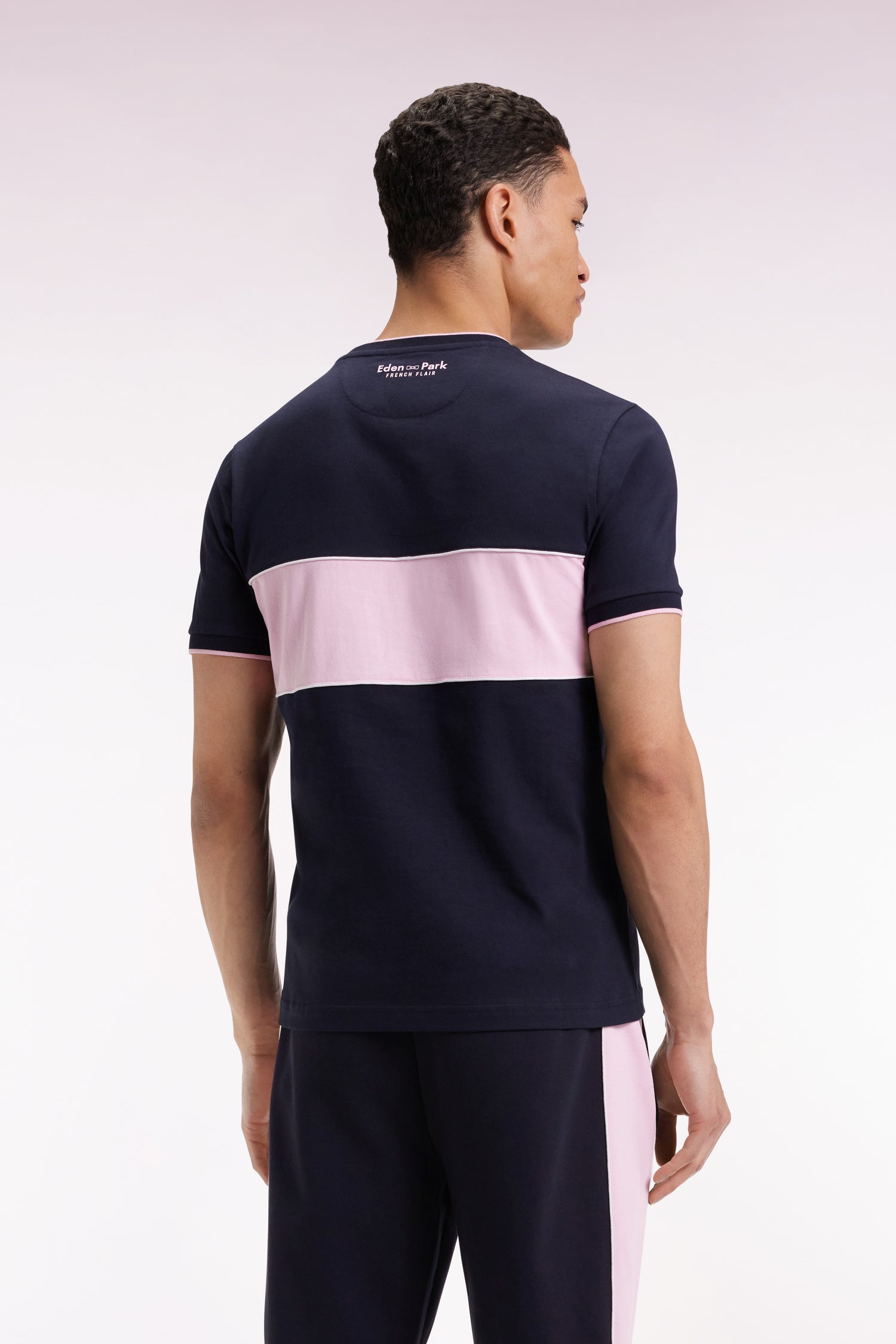 Le jersey de coton apporte de la douceur à ce T-shirt homme à la coupe droite tandis que sa découpe rose, soulignée d'un passepoil blanc ajoute à son allure sport-chic. Le col rond et les bordures de manches rehaussés de bords-côtes se dotent de fines rayures roses en accord avec sa broderie nœud papillon devenue l'emblème du vestiaire Eden Park