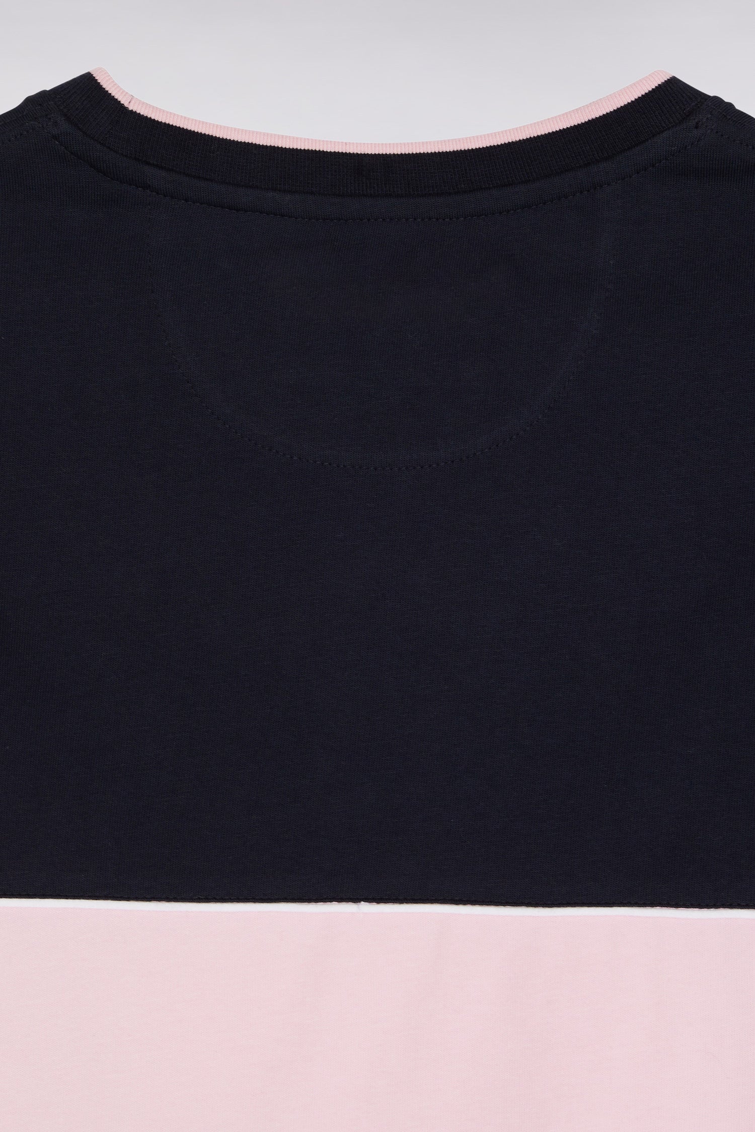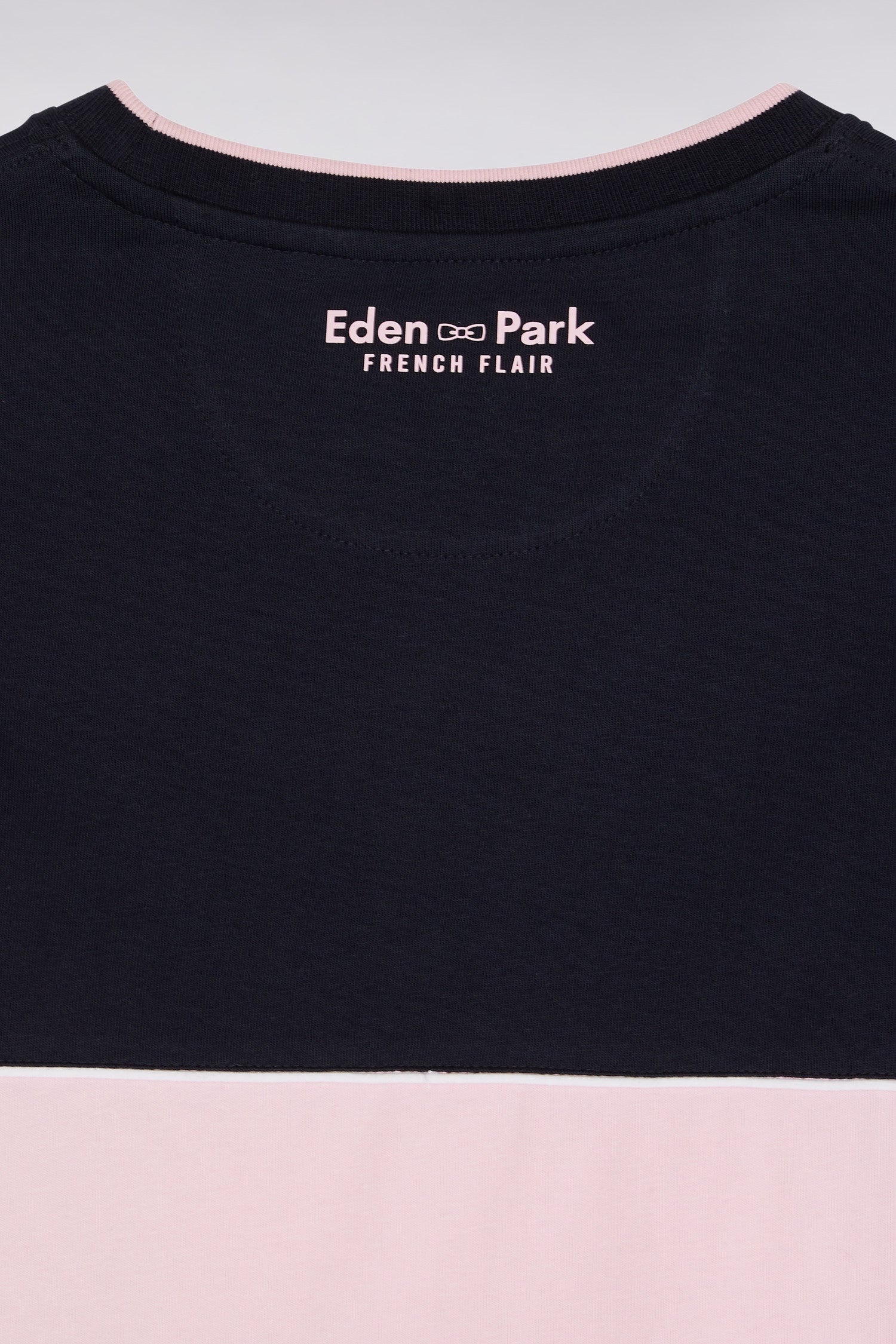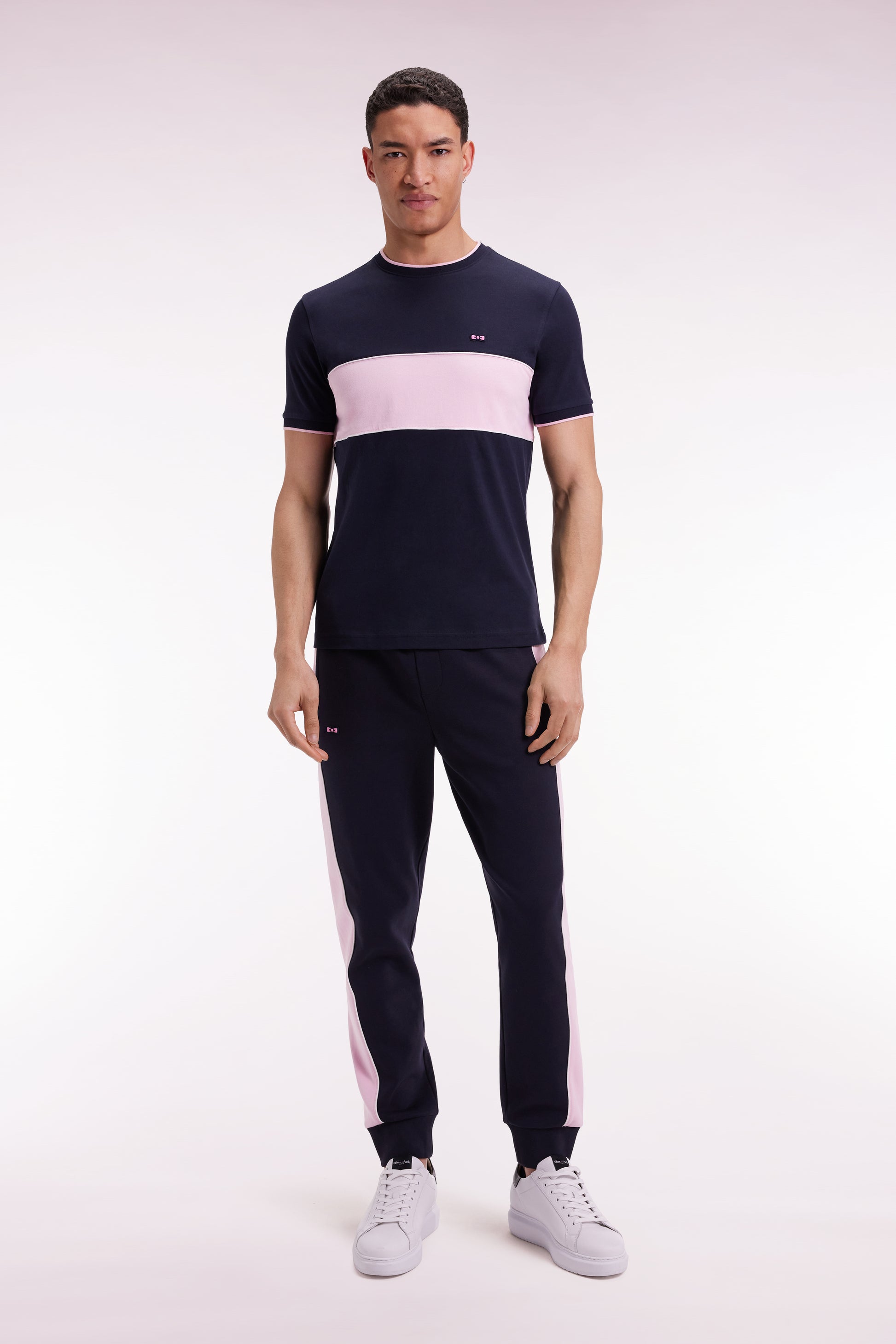 Le jersey de coton apporte de la douceur à ce T-shirt homme à la coupe droite tandis que sa découpe rose, soulignée d'un passepoil blanc ajoute à son allure sport-chic. Le col rond et les bordures de manches rehaussés de bords-côtes se dotent de fines rayures roses en accord avec sa broderie nœud papillon devenue l'emblème du vestiaire Eden Park