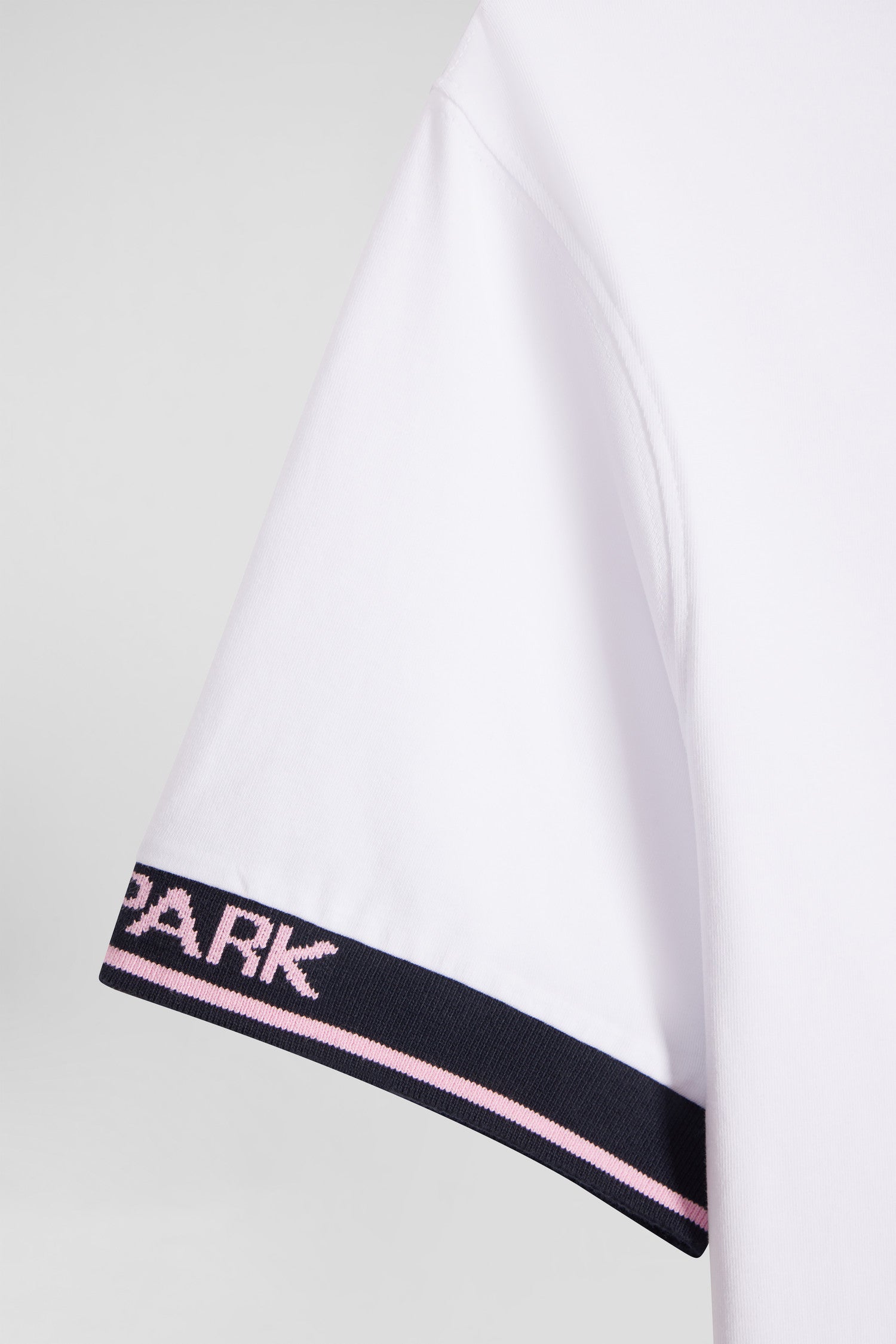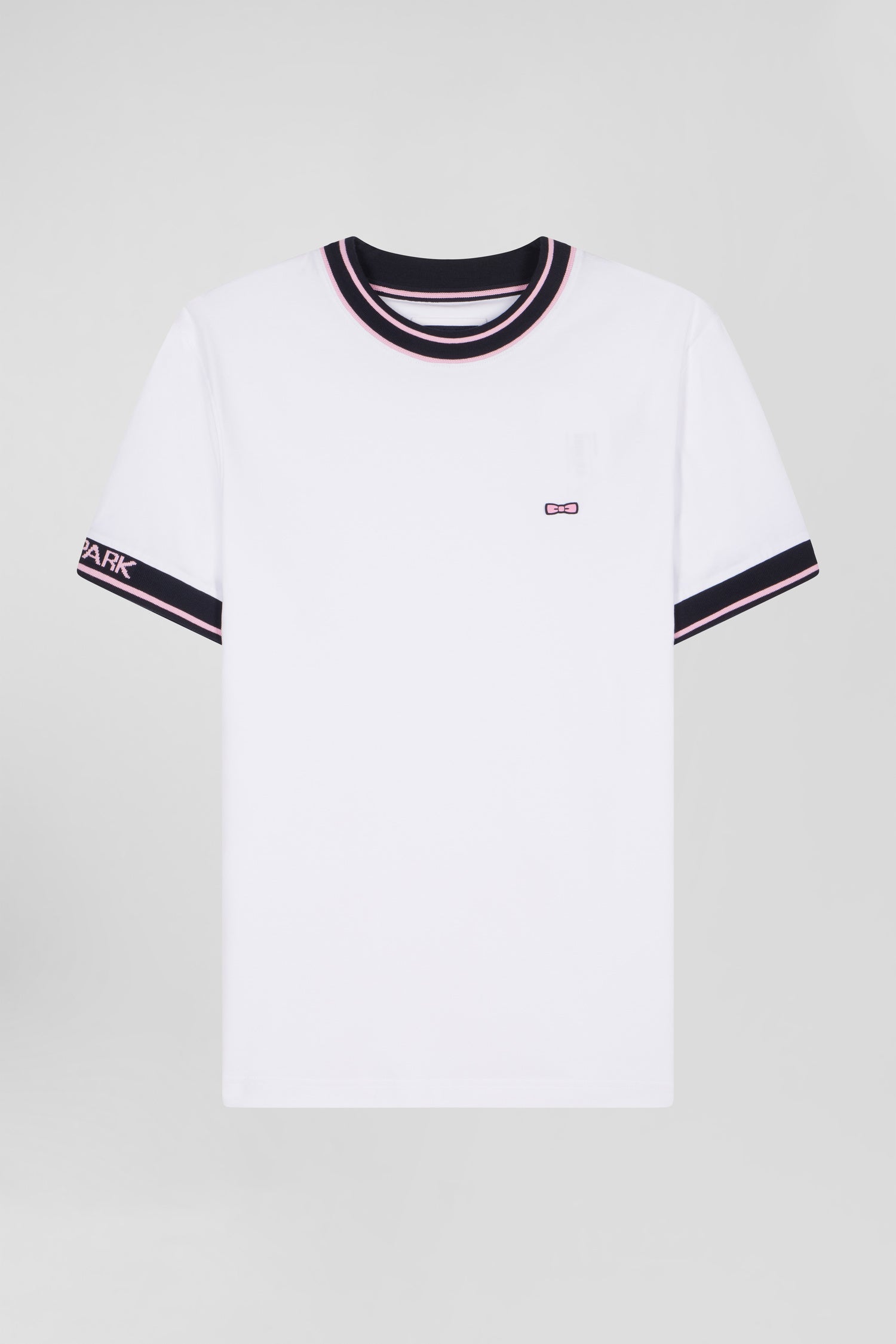 Pour une allure sportive, ce T-shirt en jersey de coton arbore sur ses manches courtes des bords-côtes rayés siglés au nom de notre Maison. Un rappel travaillé est apporté par son col rond contrasté et sa broderie poitrine nœud papillon rose.
